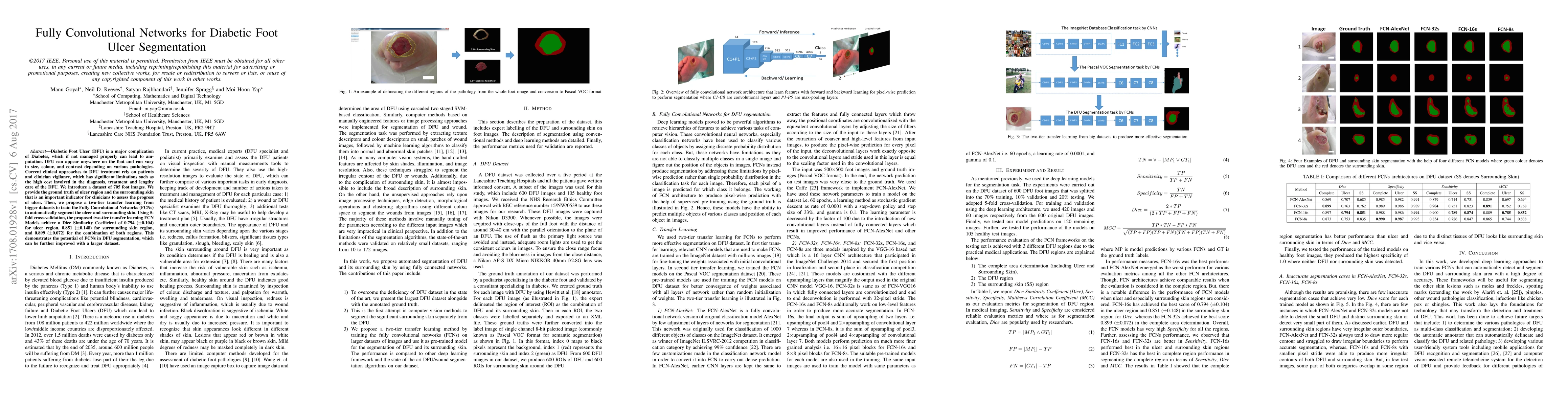 This paper introduces a dataset of 705 diabetic foot images to train Fully Convolutional Networks (FCNs) for automatic segmentation of Diabetic Foot Ulcers (DFU) and surrounding skin. The proposed two-tier transfer learning approach achieves high Dice Similarity Coefficients, indicating the potential of FCNs to improve DFU diagnosis and treatment efficiency.