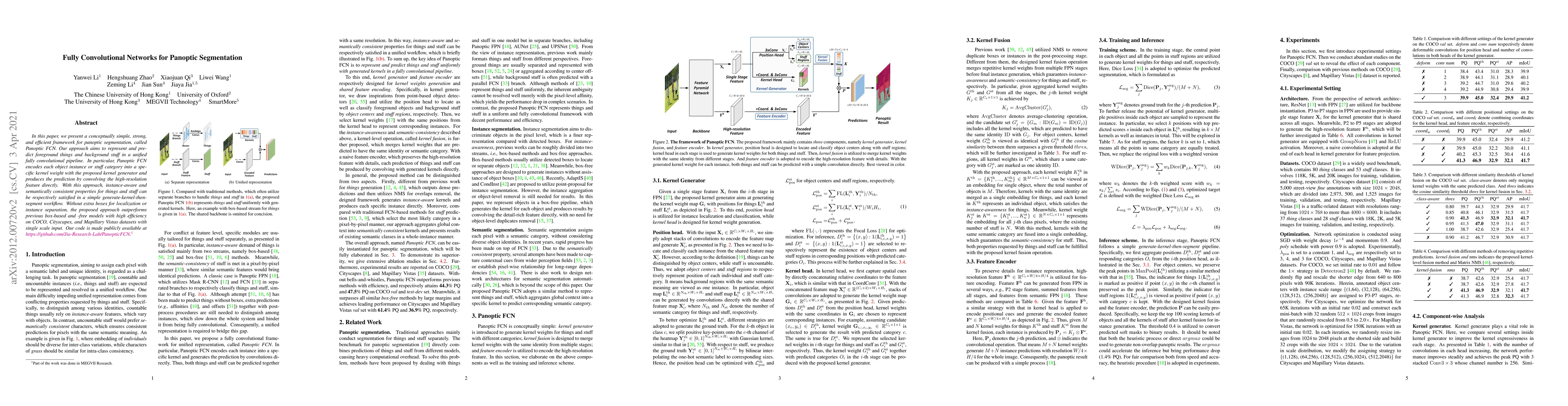 This paper introduces Panoptic FCN, a fully convolutional network for panoptic segmentation, which efficiently predicts both object instances and background stuff in a unified framework. The method outperforms previous models on COCO, Cityscapes, and Mapillary Vistas datasets without requiring localization boxes.
