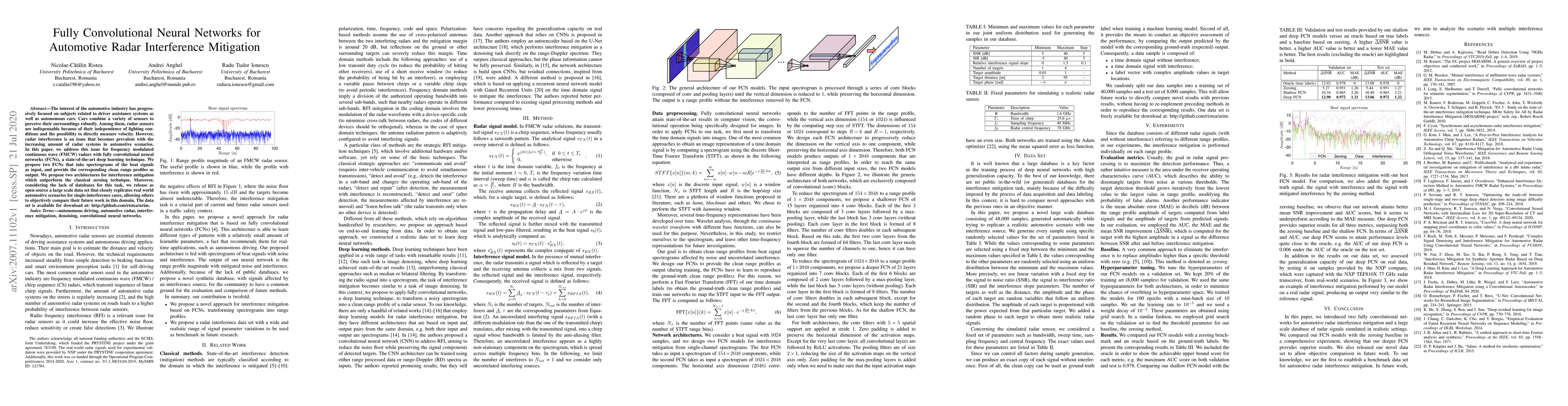 This paper proposes using fully convolutional neural networks (FCNs) to mitigate radar interference in automotive radar systems, specifically for frequency modulated continuous wave (FMCW) radars. The authors introduce two FCN architectures that outperform traditional zeroing techniques and release a large-scale dataset for benchmarking.