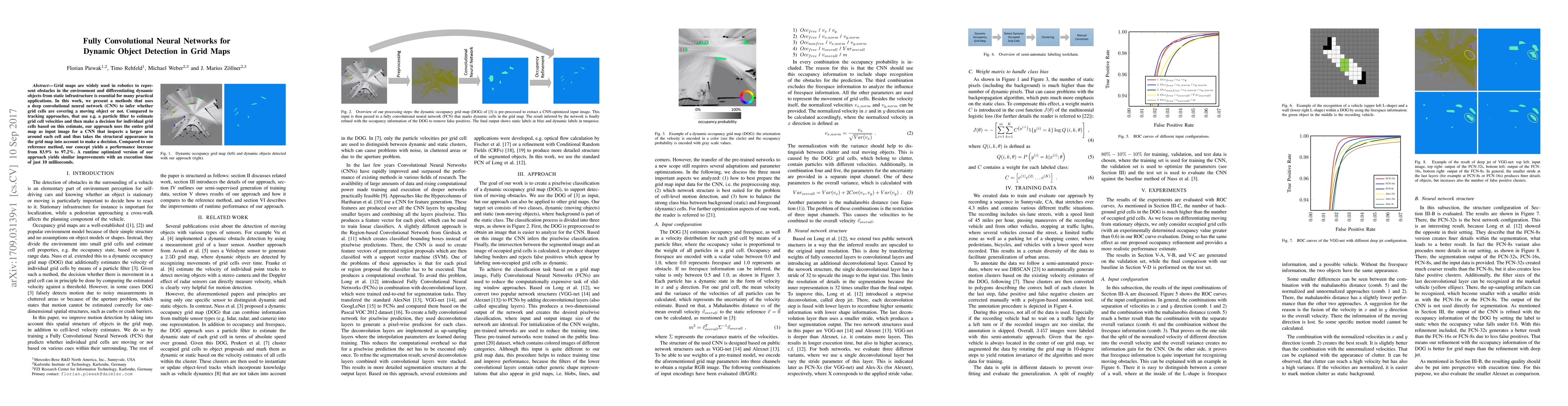 This paper proposes a fully convolutional neural network (CNN) for dynamic object detection in grid maps used in robotics, achieving a significant performance increase from 83.9% to 97.2% compared to traditional tracking methods. The CNN analyzes the entire grid map to consider structural context, offering real-time detection with a runtime of 10 milliseconds.