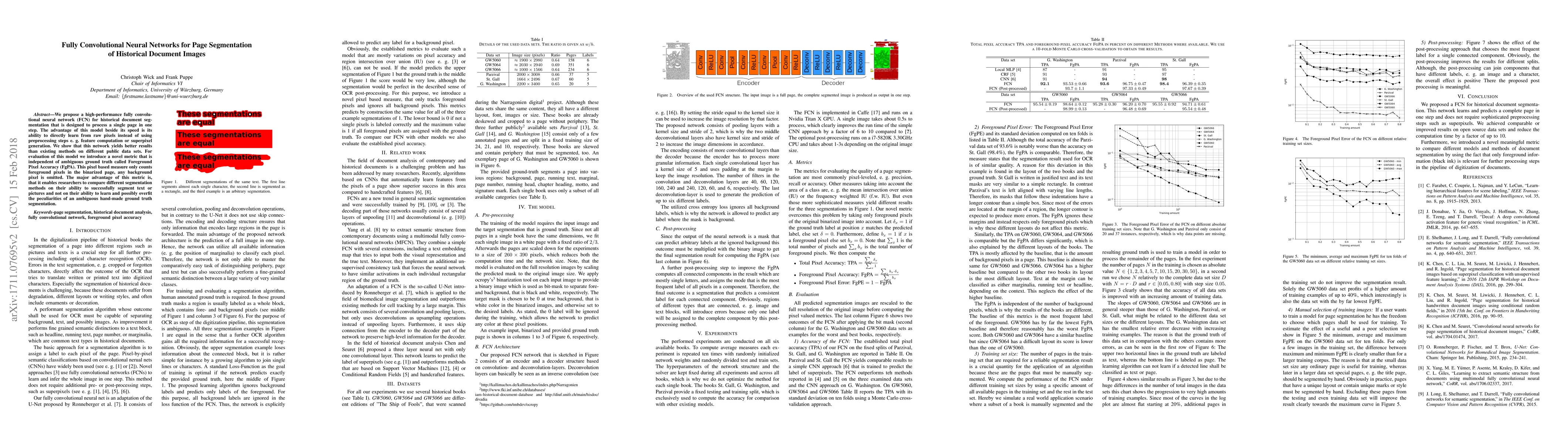 This paper proposes a fully convolutional neural network (FCN) for segmenting historical document images, achieving high performance by processing entire pages in one step and learning directly from raw pixels. The introduced Foreground Pixel Accuracy (FgPA) metric allows for unbiased comparison of segmentation methods based on their ability to segment text and images, rather than fitting to ambiguous ground truth.