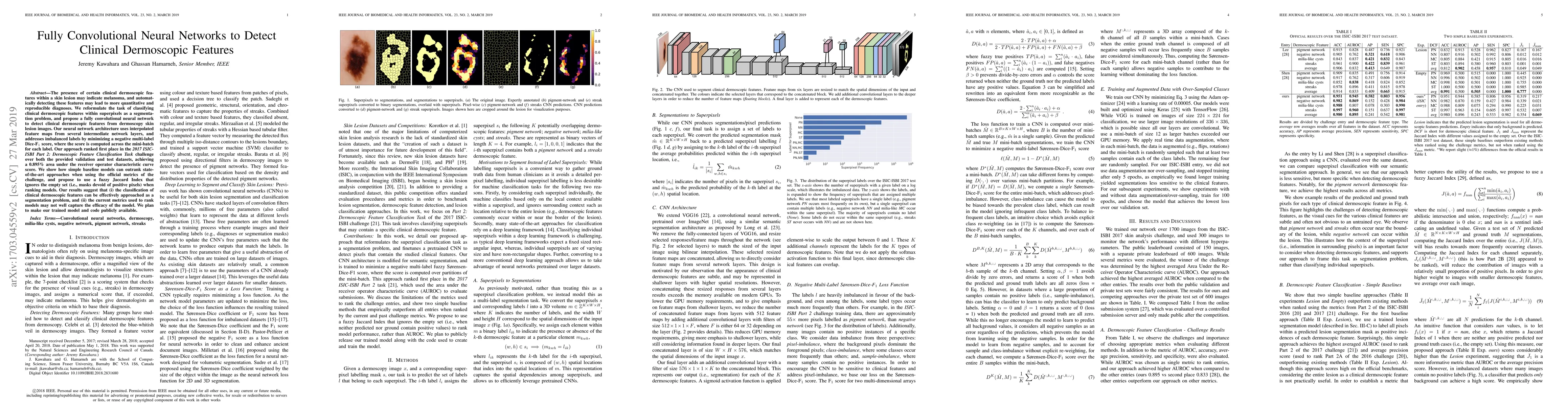 This paper proposes a fully convolutional neural network to detect clinical dermoscopic features in skin lesion images, reformulating the classification as a segmentation problem. The network achieved top performance in the 2017 ISIC-ISBI challenge, but suggests that current metrics may not fully capture model efficacy, proposing a new fuzzy Jaccard Index for better ranking.