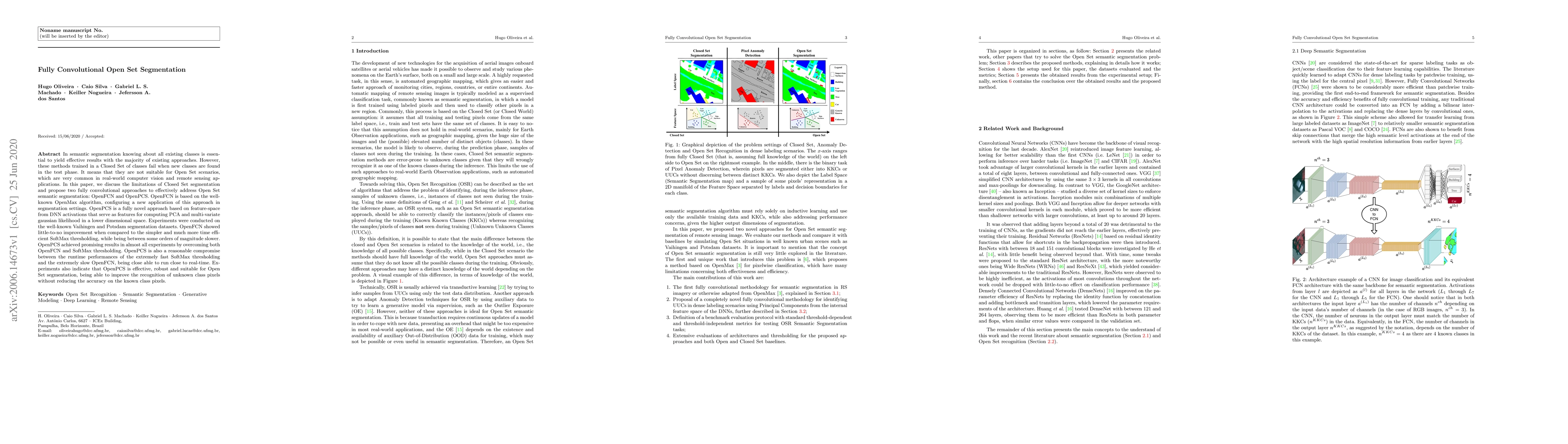 In semantic segmentation knowing about all existing classes is essential to yield effective results with the majority of existing approaches. However, these methods trained in a Closed Set of classes fail when new classes are found in the test phase. It means that they are not suitable for Open Set scenarios, which are very common in real-world computer vision and remote sensing applications. In this paper, we discuss the limitations of Closed Set segmentation and propose two fully convolutional approaches to effectively address Open Set semantic segmentation: OpenFCN and OpenPCS. OpenFCN is based on the well-known OpenMax algorithm, configuring a new application of this approach in segmentation settings. OpenPCS is a fully novel approach based on feature-space from DNN activations that serve as features for computing PCA and multi-variate gaussian likelihood in a lower dimensional space. Experiments were conducted on the well-known Vaihingen and Potsdam segmentation datasets. OpenFCN showed little-to-no improvement when compared to the simpler and much more time efficient SoftMax thresholding, while being between some orders of magnitude slower. OpenPCS achieved promising results in almost all experiments by overcoming both OpenFCN and SoftMax thresholding. OpenPCS is also a reasonable compromise between the runtime performances of the extremely fast SoftMax thresholding and the extremely slow OpenFCN, being close able to run close to real-time. Experiments also indicate that OpenPCS is effective, robust and suitable for Open Set segmentation, being able to improve the recognition of unknown class pixels without reducing the accuracy on the known class pixels.