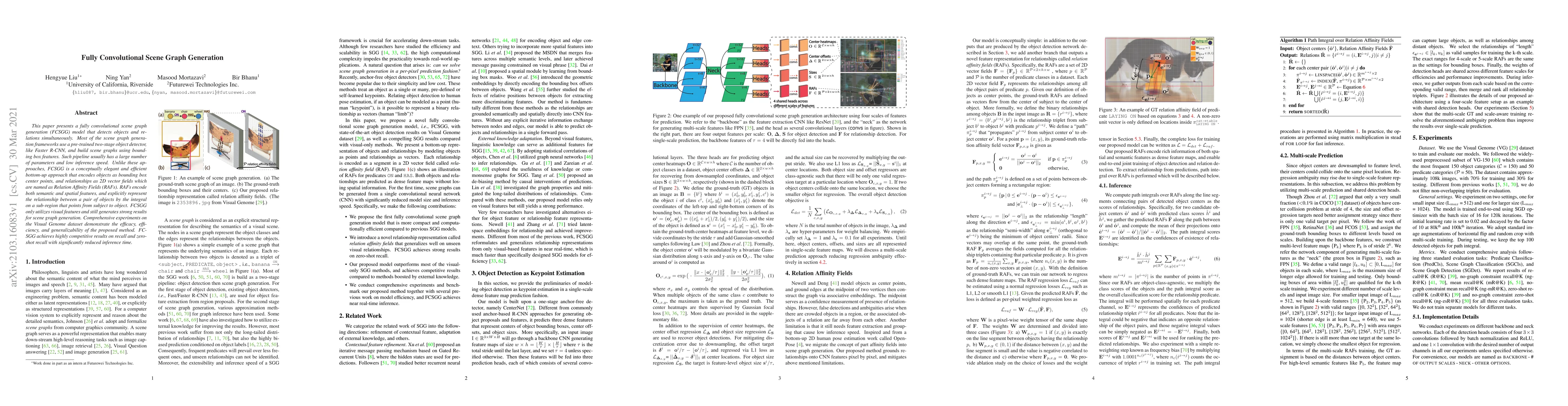 This paper introduces a fully convolutional scene graph generation (FCSGG) model that simultaneously detects objects and relations using a bottom-up approach. FCSGG employs Relation Affinity Fields (RAFs) to encode relationships, achieving competitive results with significantly reduced inference time compared to traditional two-stage detection methods.