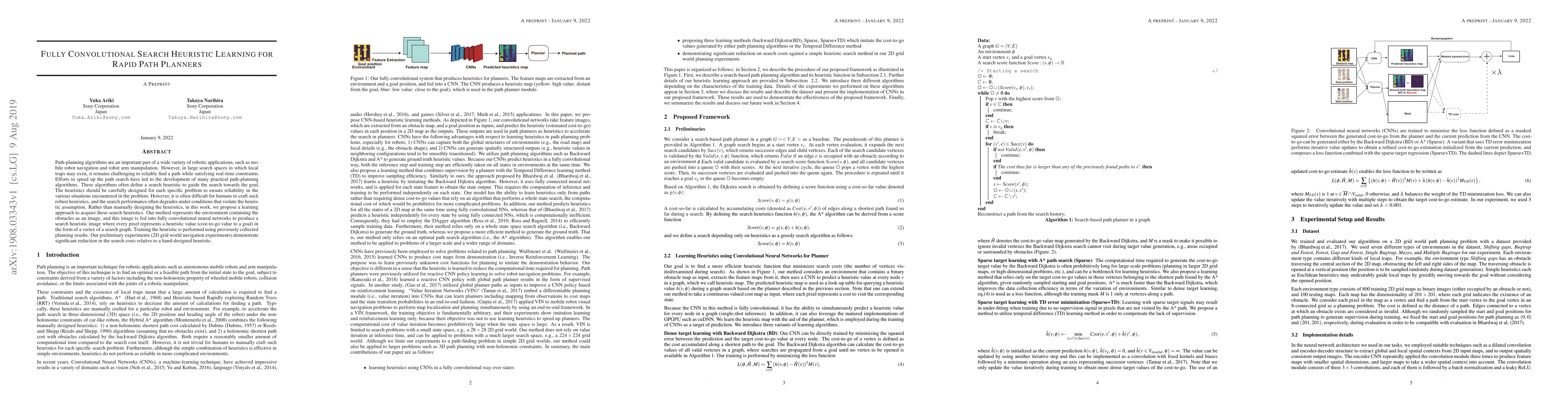 This paper proposes a learning approach to automatically generate search heuristics for path-planning algorithms using fully convolutional neural networks. The method transforms the environment into an image, which the network processes to produce heuristic values, significantly reducing search costs compared to traditional hand-designed heuristics, as demonstrated in 2D grid world navigation experiments.