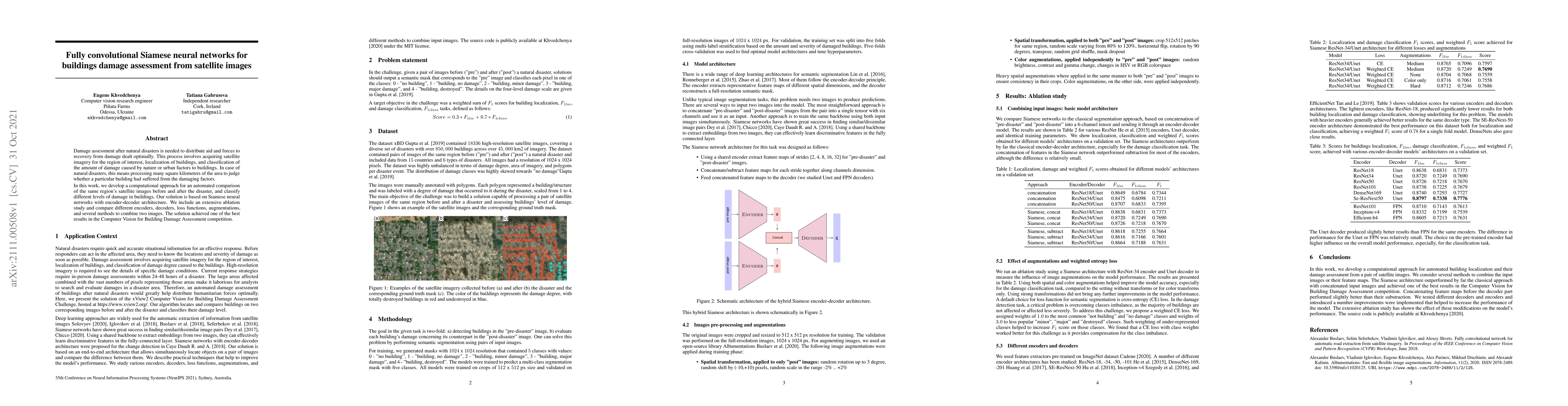 This paper proposes a fully convolutional Siamese neural network for automated assessment of building damage from satellite images before and after natural disasters. The approach includes an extensive ablation study comparing various network architectures and methods, achieving top results in a building damage assessment competition.