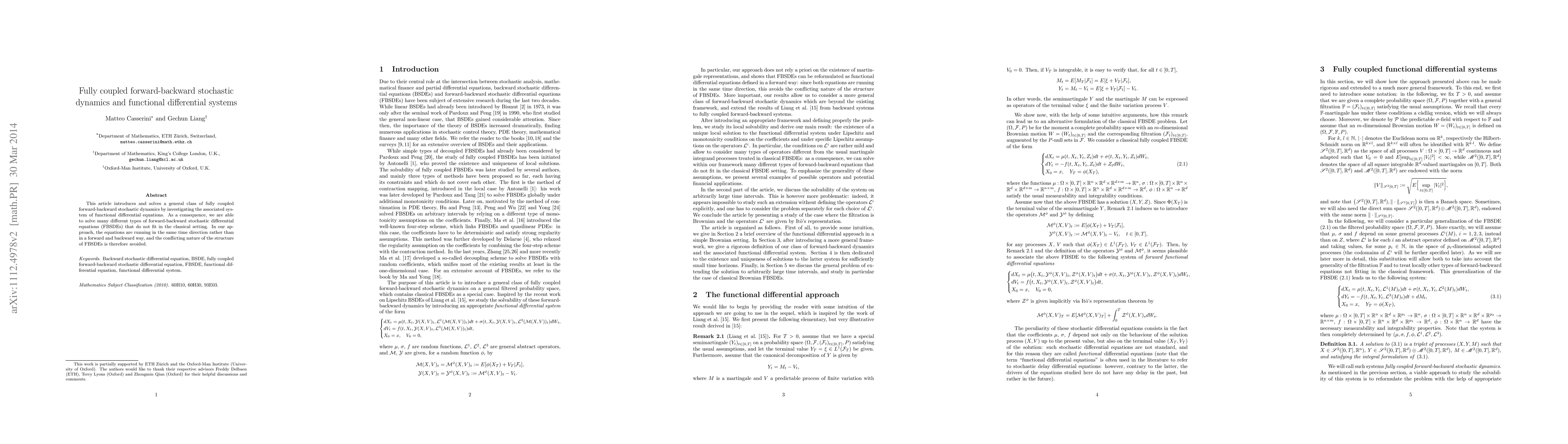 This paper solves fully coupled forward-backward stochastic dynamics via functional differential systems, avoiding the conflicting structure of traditional FBSDEs by running equations in the same time direction. The approach allows for the solution of various types of FBSDEs beyond classical settings.