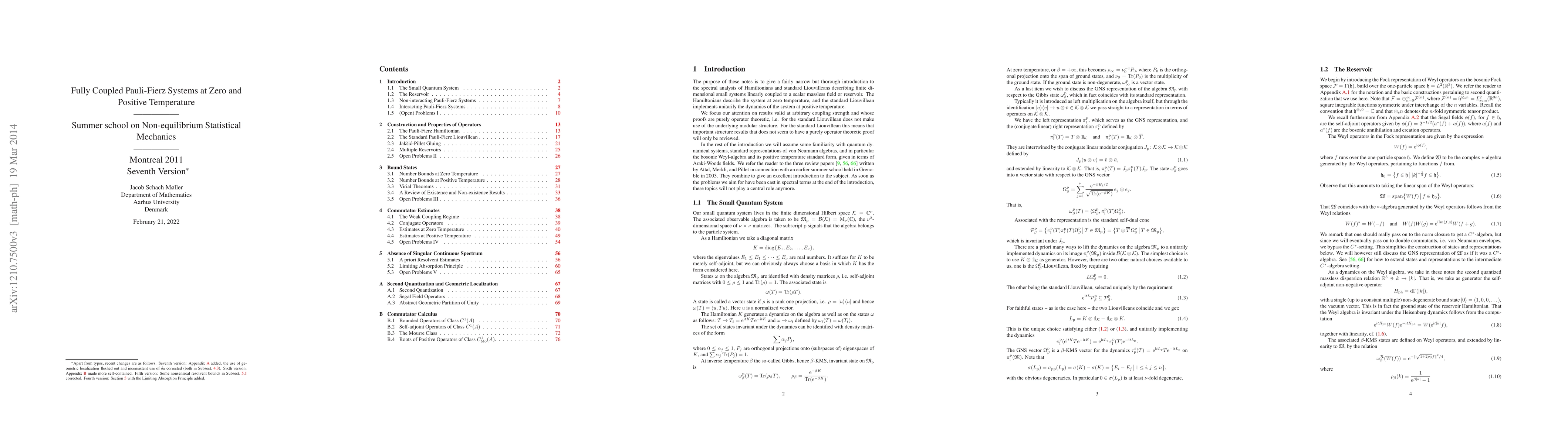 The purpose of these notes is to give a fairly narrow but thorough introduction to the spectral analysis of Hamiltonians and standard Liouvilleans describing finite dimensional small systems linearly coupled to a scalar massless field or reservoir. The Hamiltonians describe the system at zero temperature, and the standard Liouvillean implements unitarily the dynamics of the system at positive temperature. We focus our attention on results valid at arbitrary coupling strength and whose proofs are purely operator theoretic, i.e. for the standard Liouvillean does not make use of the underlying modular structure. This means that important structure results at positive temperature that does not seem to have a purely operator theoretic proof will only be reviewed.