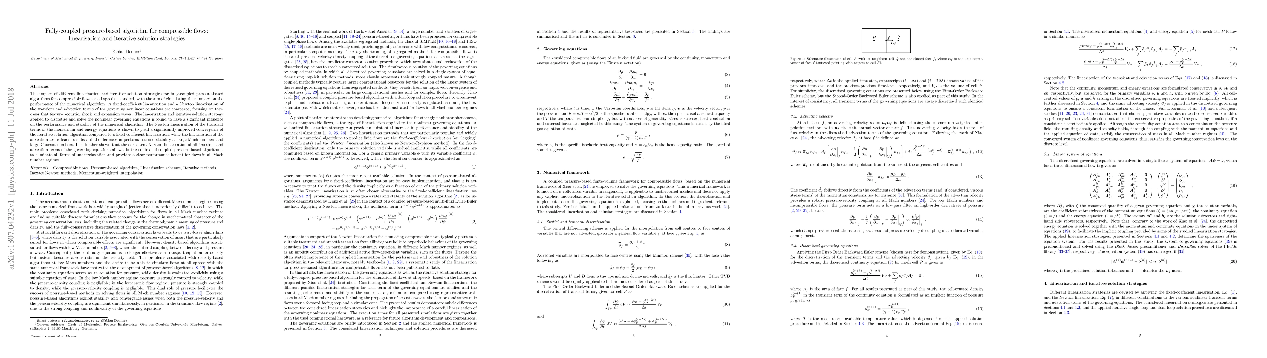 This research examines the effects of various linearization and iterative solution methods in compressible flow simulations using fully-coupled pressure-based algorithms. It finds that Newton linearization of transient terms significantly improves algorithm convergence, while consistent Newton linearization of all transient and advection terms enhances performance across all Mach number regimes, eliminating the need for underrelaxation.