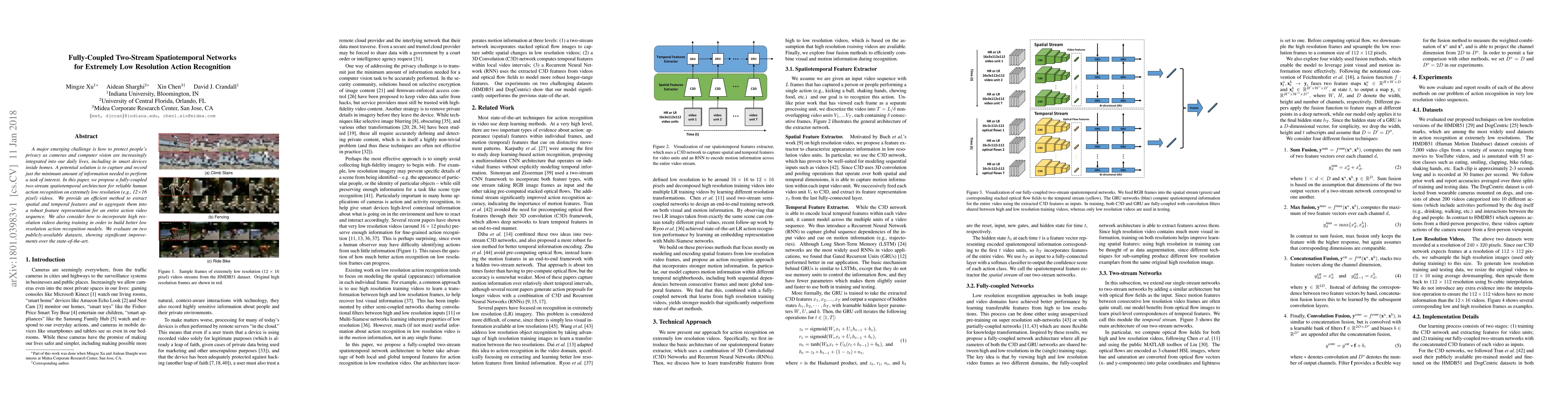 This paper proposes a fully-coupled two-stream spatiotemporal network for recognizing human actions in extremely low resolution videos (e.g., 12x16 pixels). The method efficiently extracts and aggregates spatial and temporal features, and it leverages high-resolution training data to enhance low-resolution model performance, achieving state-of-the-art results on two datasets.