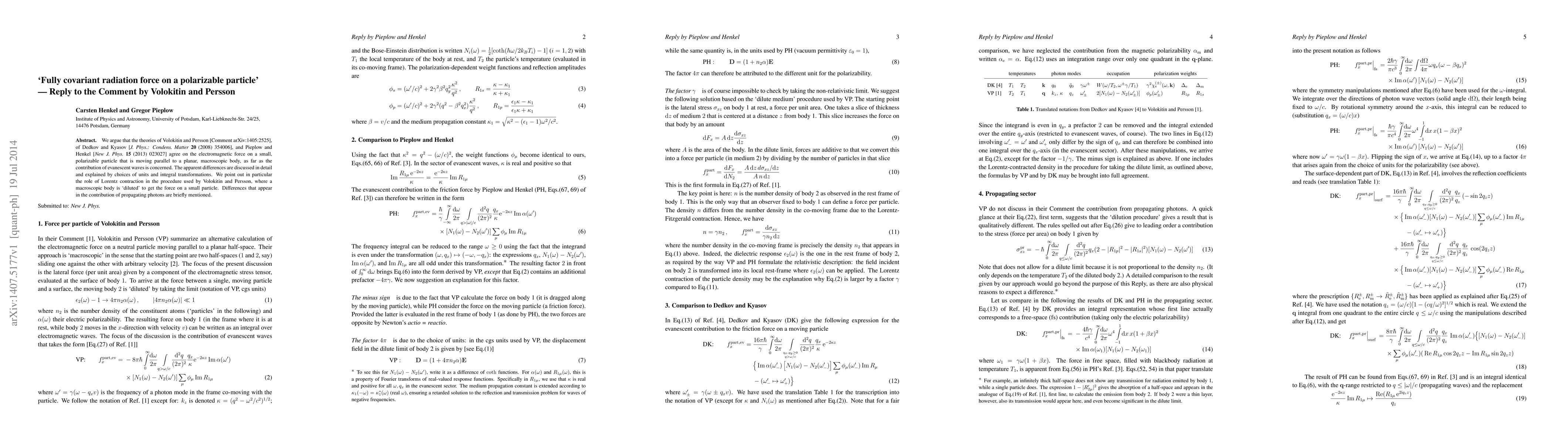 We argue that the theories of Volokitin and Persson [Comment arXiv:1405:2525], of Dedkov and Kyasov [J. Phys.: Condens. Matter 20 (2008) 354006], and Pieplow and Henkel [New J. Phys. 15 (2013) 023027] agree on the electromagnetic force on a small, polarizable particle that is moving parallel to a planar, macroscopic body, as far as the contribution of evanescent waves is concerned. The apparent differences are discussed in detail and explained by choices of units and integral transformations. We point out in particular the role of Lorentz contraction in the procedure used by Volokitin and Persson, where a macroscopic body is "diluted" to get the force on a small particle. Differences that appear in the contribution of propagating photons are briefly mentioned.