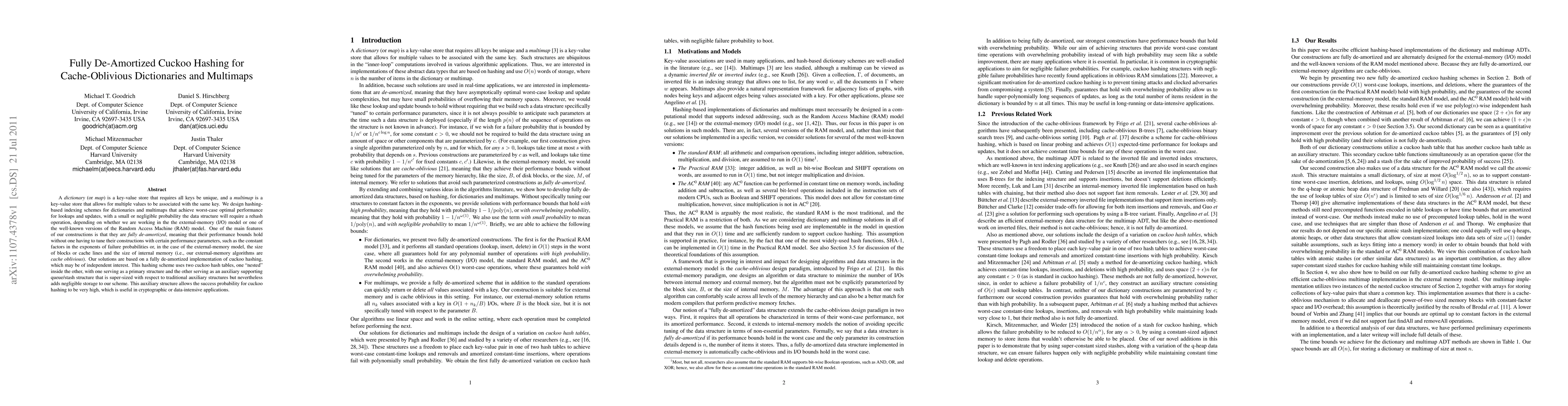 This paper presents fully de-amortized cuckoo hashing for cache-oblivious dictionaries and multimaps, achieving optimal performance for lookups and updates with minimal rehashing probability. The design uses two nested cuckoo hash tables, with an auxiliary super-sized structure to maintain high success probability, making it effective for cryptographic or data-intensive applications.