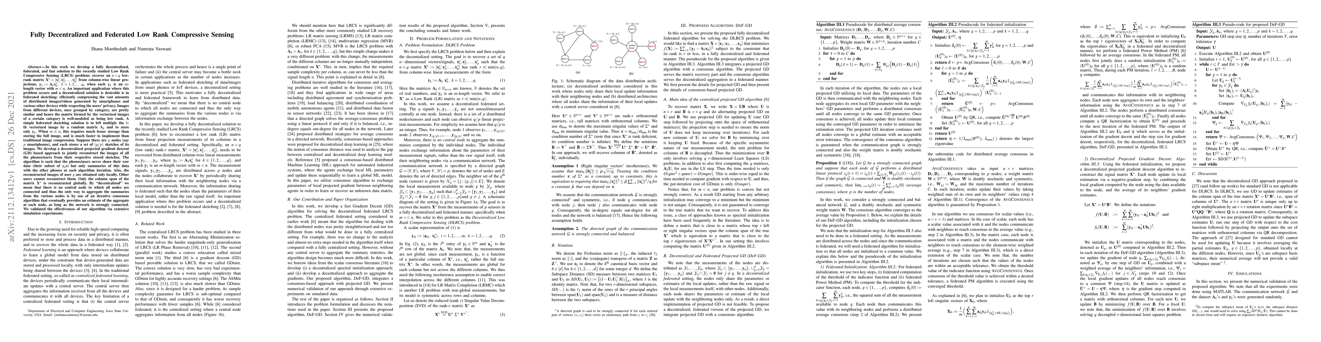 This paper proposes a decentralized, federated approach to solve the Low Rank Compressive Sensing (LRCS) problem, enabling the efficient recovery of low-rank matrices from distributed projections while preserving privacy. The method reconstructs images from sketches stored locally on devices without sharing raw data, using a decentralized gradient descent algorithm.