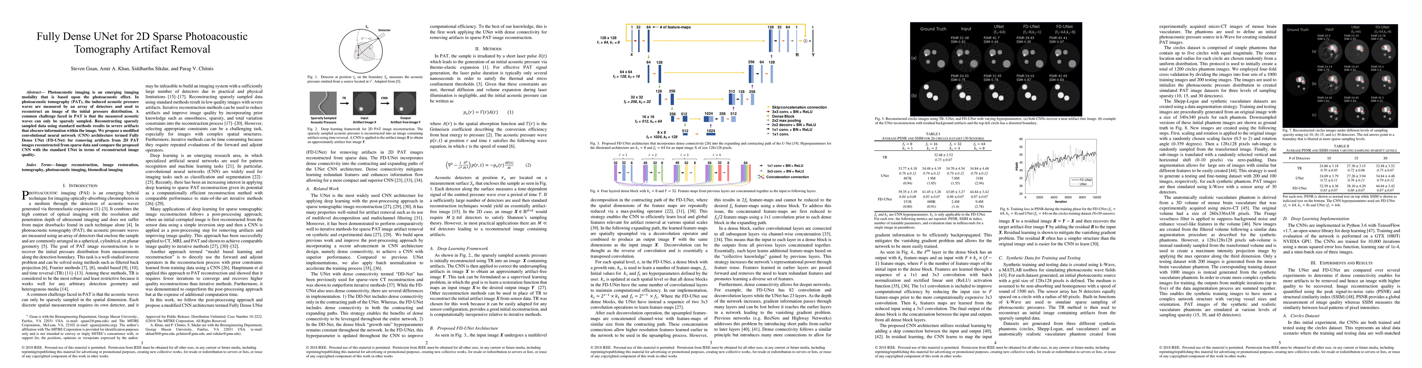 A new neural network architecture called Fully Dense UNet is proposed to remove artifacts from 2D photoacoustic tomography images reconstructed from sparsely sampled data, improving image quality compared to a standard UNet approach.