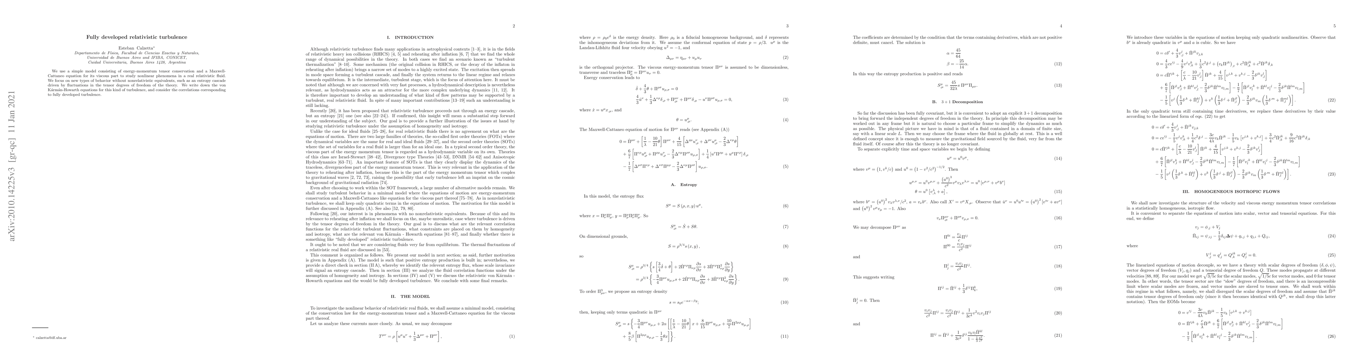 We use a simple model consisting of energy-momentum tensor conservation and a Maxwell-Cattaneo equation for its viscous part to study nonlinear phenomena in a real relativistic fluid. We focus on new types of behavior without nonrelativistic equivalents, such as an entropy cascade driven by fluctuations in the tensor degrees of freedom of the theory. We write down the von K\'arm\'an-Howarth equations for this kind of turbulence, and consider the correlations corresponding to fully developed turbulence.
