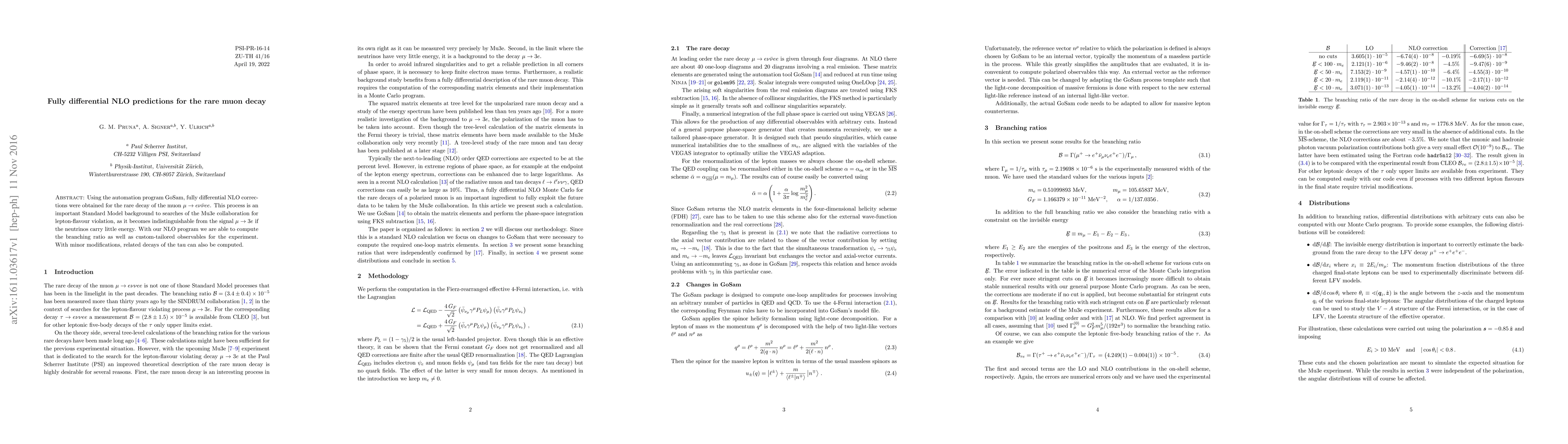 Using the automation program GoSam, fully differential NLO corrections were obtained for the rare decay of the muon $\mu\to e\nu\bar\nu ee$. This process is an important Standard Model background to searches of the Mu3e collaboration for lepton-flavour violation, as it becomes indistinguishable from the signal $\mu\to 3e$ if the neutrinos carry little energy. With our NLO program we are able to compute the branching ratio as well as custom-tailored observables for the experiment. With minor modifications, related decays of the tau can also be computed.