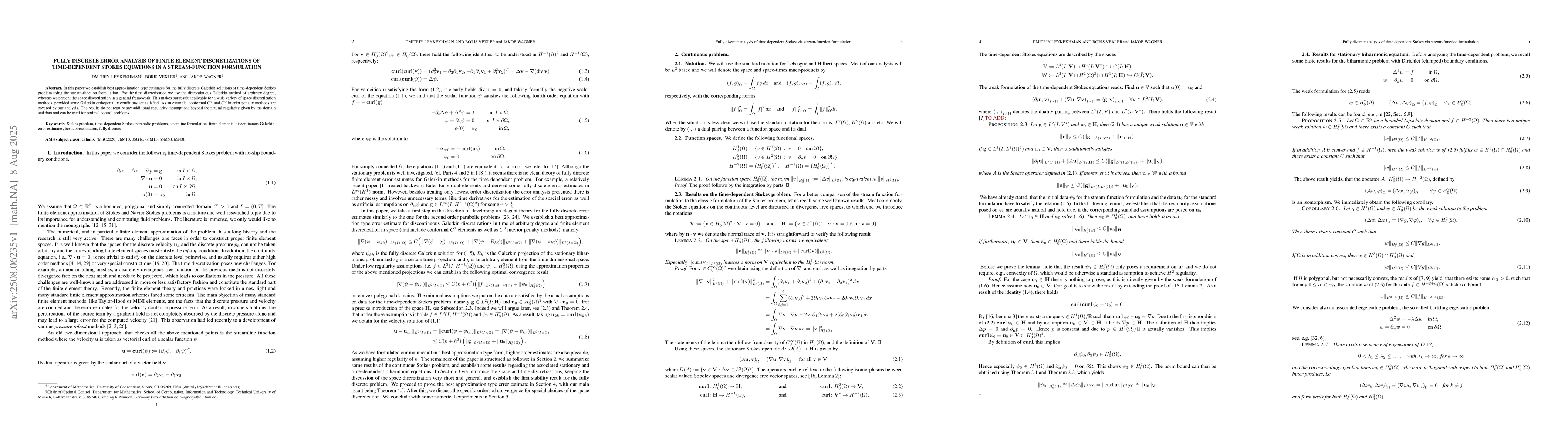 The paper employs fully discrete error analysis for finite element discretizations of time-dependent Stokes equations using a stream-function formulation, combining discontinuous Galerkin method for time discretization with general space discretization methods satisfying Galerkin orthogonality conditions.