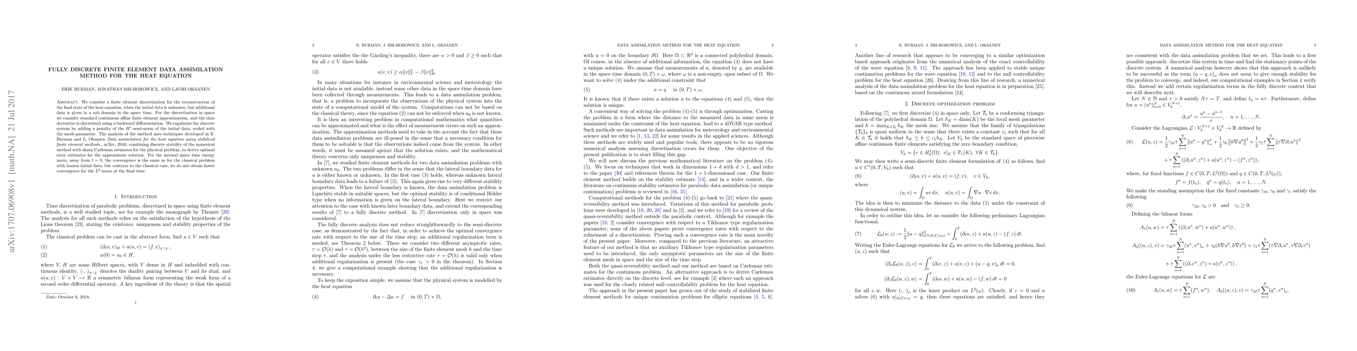 We consider a finite element discretization for the reconstruction of the final state of the heat equation, when the initial data is unknown, but additional data is given in a sub domain in the space time. For the discretization in space we consider standard continuous affine finite element approximation, and the time derivative is discretized using a backward differentiation. We regularize the discrete system by adding a penalty of the $H^1$-semi-norm of the initial data, scaled with the mesh-parameter. The analysis of the method uses techniques developed in E. Burman and L. Oksanen, Data assimilation for the heat equation using stabilized finite element methods, arXiv, 2016, combining discrete stability of the numerical method with sharp Carleman estimates for the physical problem, to derive optimal error estimates for the approximate solution. For the natural space time energy norm, away from $t=0$, the convergence is the same as for the classical problem with known initial data, but contrary to the classical case, we do not obtain faster convergence for the $L^2$-norm at the final time.