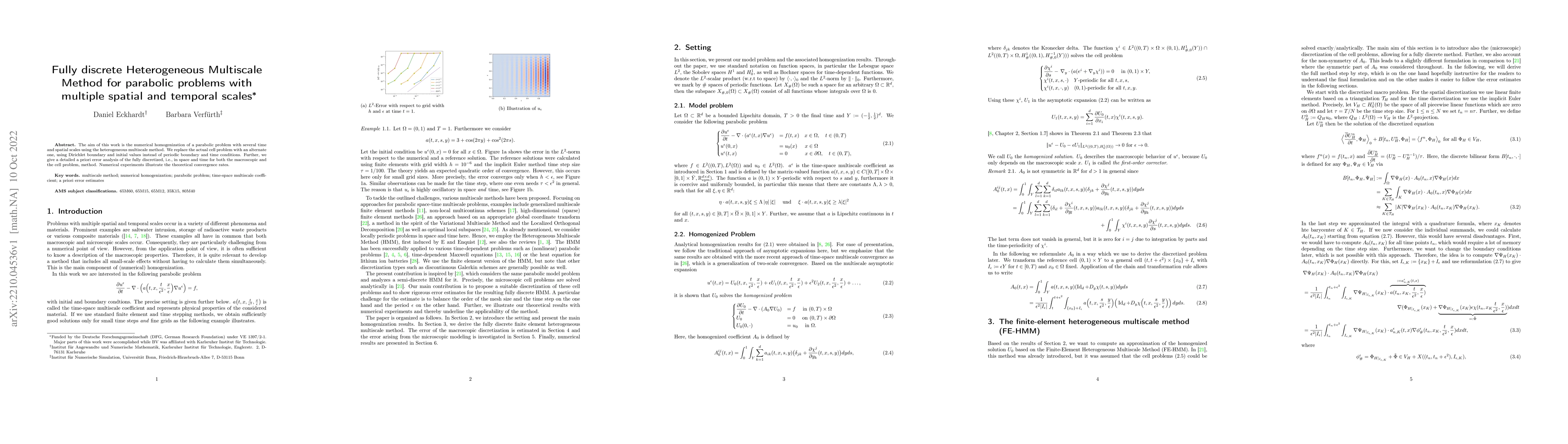 The paper presents a fully discrete HMM for parabolic problems with multiple scales, including a comprehensive a priori error analysis and numerical experiments.