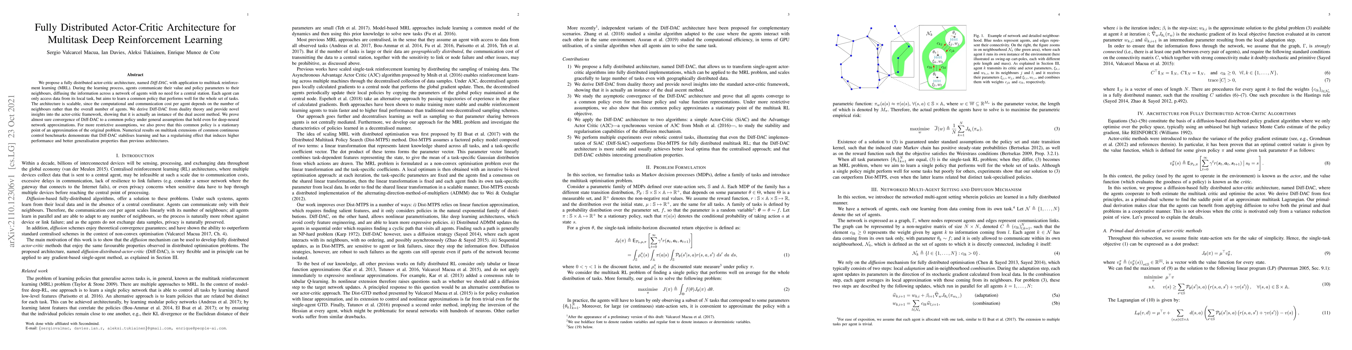This paper introduces Diff-DAC, a fully distributed actor-critic architecture for multitask reinforcement learning, enabling agents to communicate locally without a central station. It demonstrates scalability and almost sure convergence, showing improved performance and generalisation over previous methods in numerical experiments.