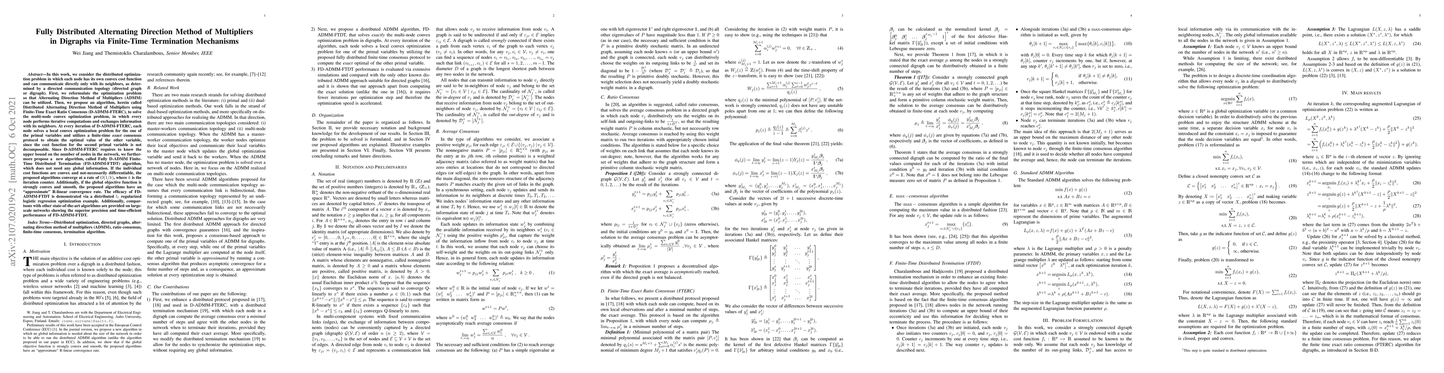 In this work, we consider the distributed optimization problem in which each node has its own convex cost function and can communicate directly only with its neighbors, as determined by a directed communication topology (directed graph or digraph). First, we reformulate the optimization problem so that Alternating Direction Method of Multipliers (ADMM) can be utilized. Then, we propose an algorithm, herein called Distributed Alternating Direction Method of Multipliers using Finite-Time Exact Ratio Consensus (D-ADMM-FTERC), to solve the multi-node convex optimization problem, in which every node performs iterative computations and exchanges information with its neighbors. At every iteration of D-ADMM-FTERC, each node solves a local convex optimization problem for the one of the primal variables and utilizes a finite-time exact consensus protocol to obtain the optimal value of the other variable, since the cost function for the second primal variable is not decomposable. Since D-ADMM-FTERC requires to know the upper bound on the number of nodes in the network, we furthermore propose a new algorithm, called Fully D-ADMM Finite-Time Distributed Termination (FD-ADMM-FTDT) algorithm, which does not need any global information. If the individual cost functions are convex and not-necessarily differentiable, the proposed algorithms converge at a rate of O(1/k), where k is the iteration counter. Additionally, if the global objective function is strongly convex and smooth, the proposed algorithms have an "approximate" R-linear convergence rate. The efficacy of FD-ADMM-FTDT is demonstrated via a distributed L1 regularized logistic regression optimization example. Additionally, comparisons with other state-of-the-art algorithms are provided on large-scale networks showing the superior precision and time-efficient performance of FD-ADMM-FTDT.