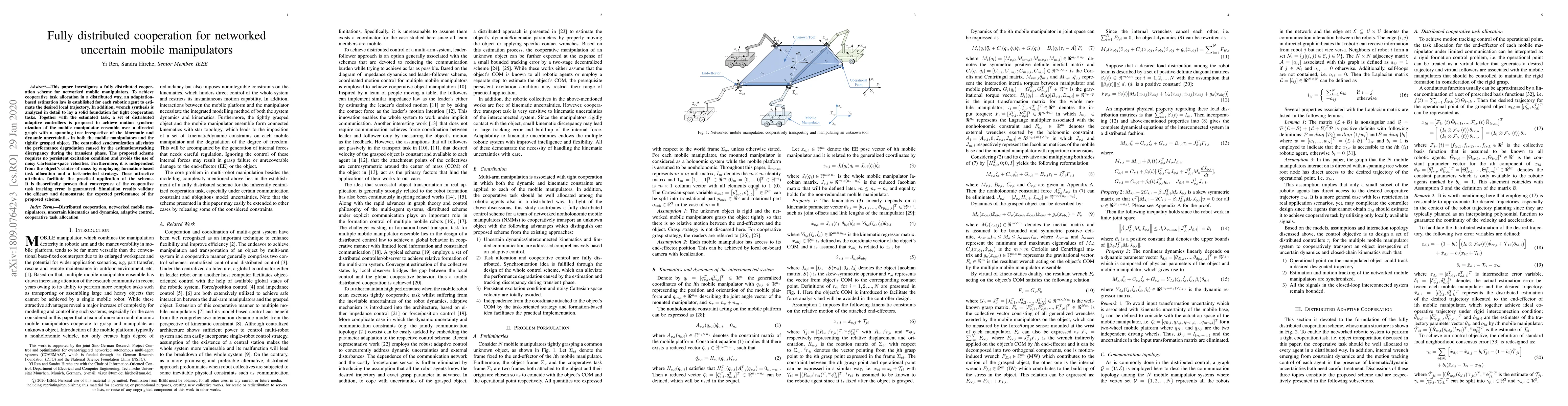 This paper investigates a fully distributed cooperation scheme for networked mobile manipulators. To achieve cooperative task allocation in a distributed way, an adaptation-based estimation law is established for each robotic agent to estimate the desired local trajectory. In addition, wrench synthesis is analyzed in detail to lay a solid foundation for tight cooperation tasks. Together with the estimated task, a set of distributed adaptive controllers is proposed to achieve motion synchronization of the mobile manipulator ensemble over a directed graph with a spanning tree irrespective of the kinematic and dynamic uncertainties in both the mobile manipulators and the tightly grasped object. The controlled synchronization alleviates the performance degradation caused by the estimation/tracking discrepancy during the transient phase. The proposed scheme requires no persistent excitation condition and avoids the use of noisy Cartesian-space velocities. Furthermore, it is independent from the object's center of mass by employing formation-based task allocation and a task-oriented strategy. These attractive attributes facilitate the practical application of the scheme. It is theoretically proven that convergence of the cooperative task tracking error is guaranteed. Simulation results validate the efficacy and demonstrate the expected performance of the proposed scheme.