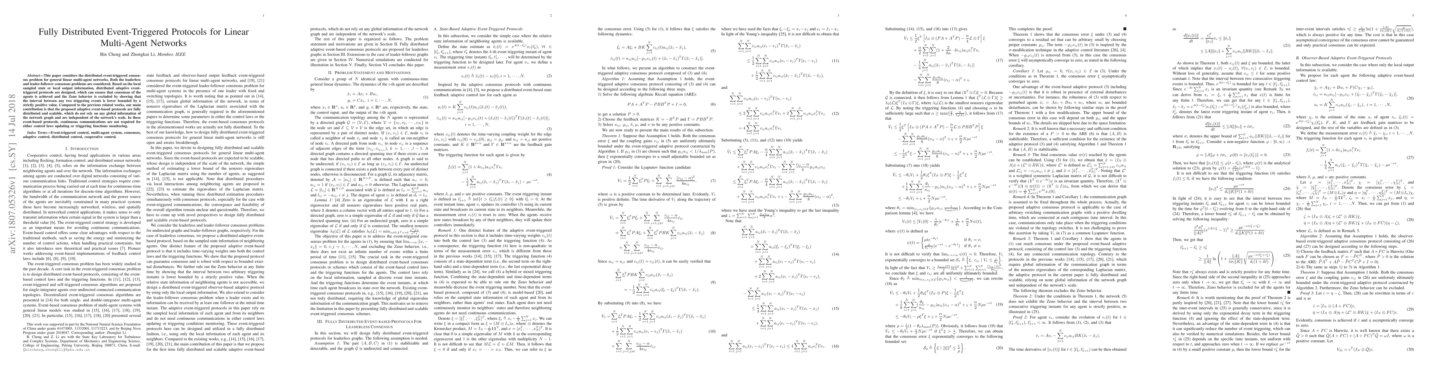 This paper proposes fully distributed adaptive event-triggered protocols for consensus in linear multi-agent networks, ensuring scalability and eliminating Zeno behavior without relying on global network information. The protocols achieve consensus using local state or output data, and do not require continuous communication.