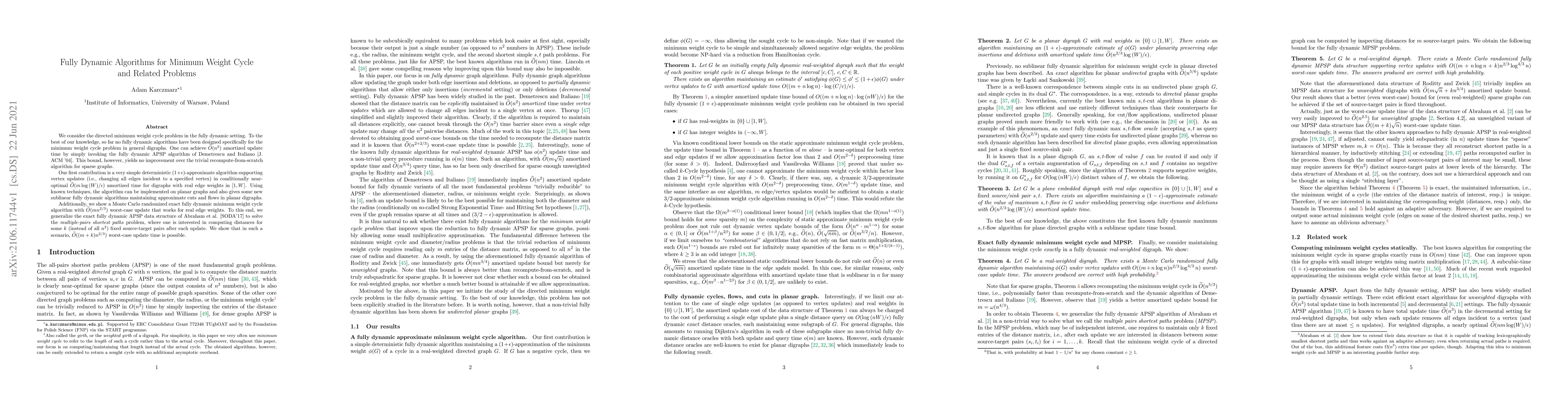 We consider the directed minimum weight cycle problem in the fully dynamic setting. To the best of our knowledge, so far no fully dynamic algorithms have been designed specifically for the minimum weight cycle problem in general digraphs. One can achieve $\tilde{O}(n^2)$ amortized update time by simply invoking the fully dynamic APSP algorithm of Demetrescu and Italiano [J. ACM'04]. This bound, however, yields no improvement over the trivial recompute-from-scratch algorithm for sparse graphs. Our first contribution is a very simple deterministic $(1+\epsilon)$-approximate algorithm supporting vertex updates (i.e., changing all edges incident to a specified vertex) in conditionally near-optimal $\tilde{O}(m\log{(W)}/\epsilon)$ amortized time for digraphs with real edge weights in $[1,W]$. Using known techniques, the algorithm can be implemented on planar graphs and also gives some new sublinear fully dynamic algorithms maintaining approximate cuts and flows in planar digraphs. Additionally, we show a Monte Carlo randomized exact fully dynamic minimum weight cycle algorithm with $\tilde{O}(mn^{2/3})$ worst-case update that works for real edge weights. To this end, we generalize the exact fully dynamic APSP data structure of Abraham et al. [SODA'17] to solve the ``multiple-pairs shortest paths problem'', where one is interested in computing distances for some $k$ (instead of all $n^2$) fixed source-target pairs after each update. We show that in such a scenario, $\tilde{O}((m+k)n^{2/3})$ worst-case update time is possible.