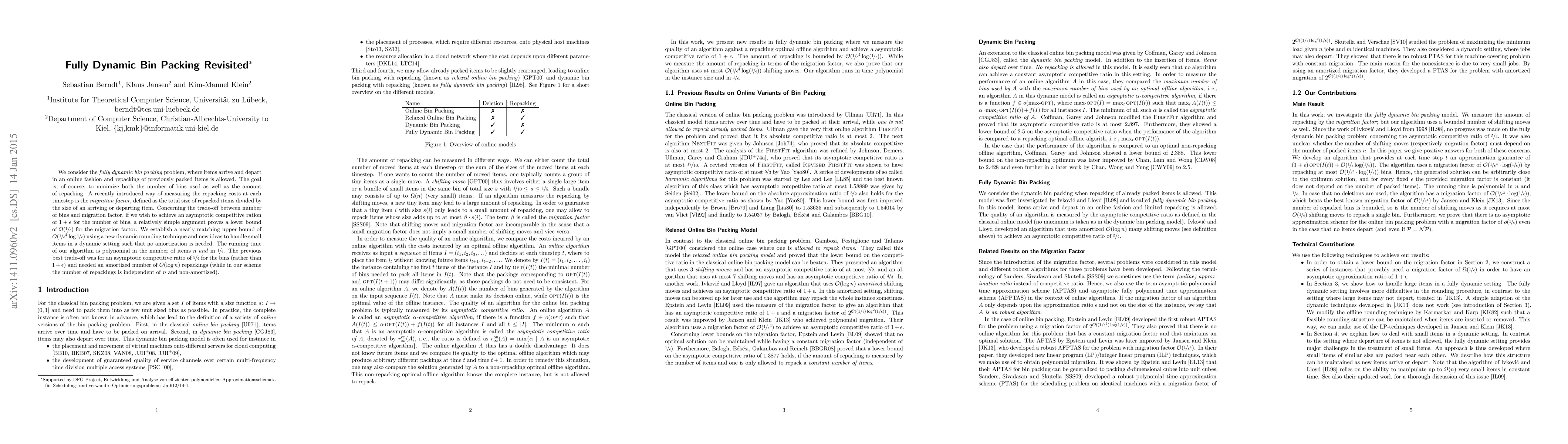 Researchers revisited the fully dynamic bin packing problem, establishing a nearly matching upper bound of $O(rac{1}{ ext{Å}}^4 ext{log } rac{1}{ ext{Å}})$ for minimizing repacking costs while achieving an asymptotic competitive ratio of $1 + ext{Å}$ for the number of bins.