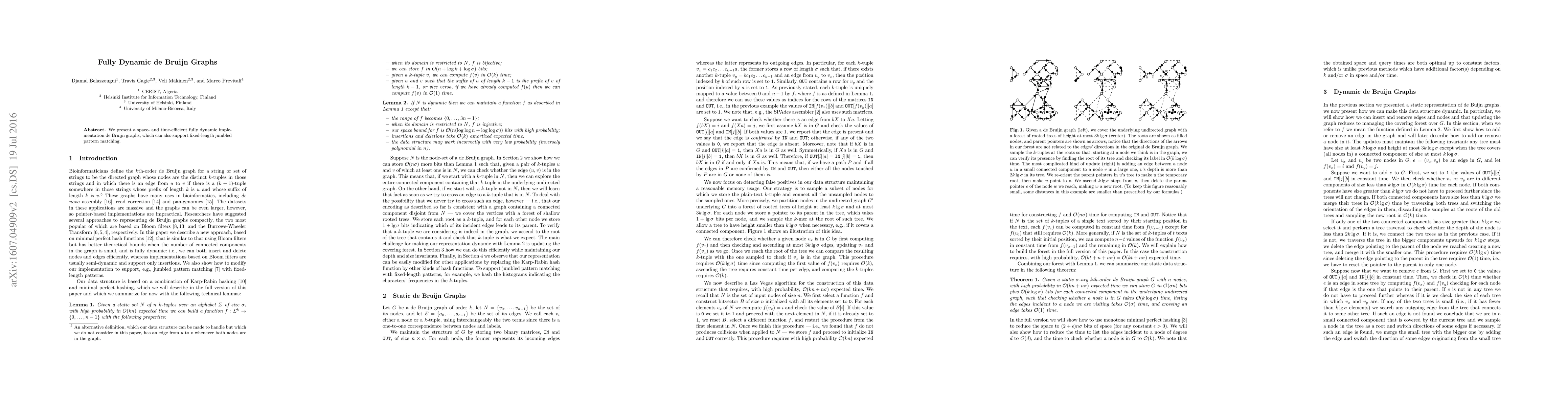 Summary: This paper introduces a fully dynamic and efficient implementation of de Bruijn graphs, enabling both space and time optimization while supporting fixed-length pattern matching in jumbled sequences.