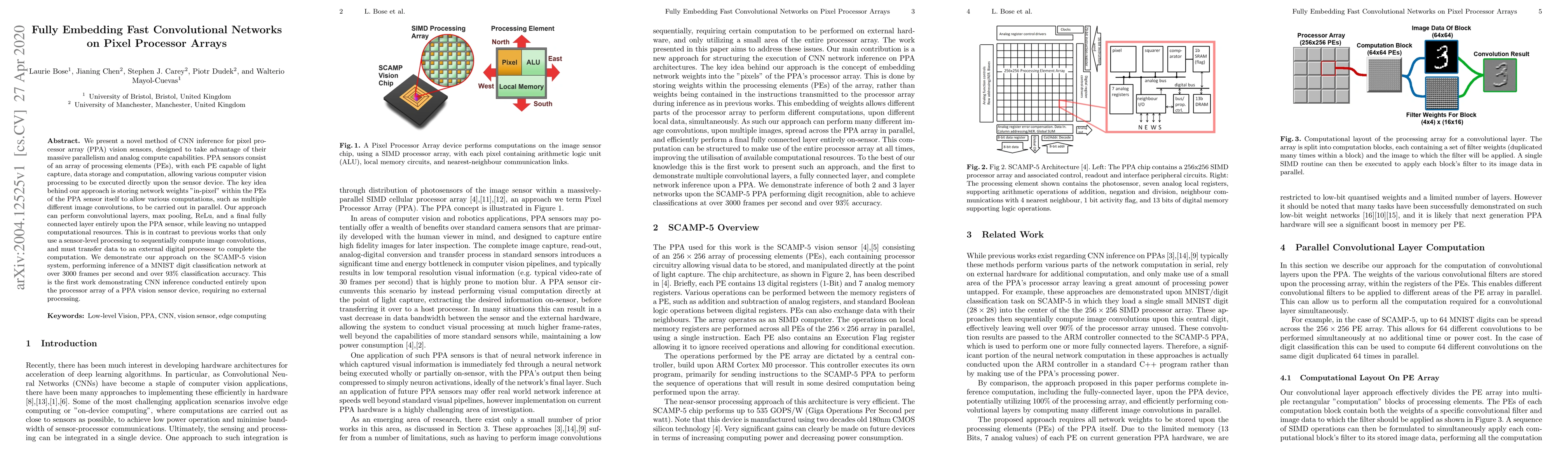 This paper introduces a method for fully embedding fast convolutional neural networks (CNNs) on pixel processor arrays (PPAs) to leverage their parallel processing and analog compute capabilities. The proposed approach stores network weights within the PPA's processing elements, enabling parallel execution of convolutional layers, max pooling, ReLu, and fully connected layers directly on the sensor without external processing, achieving over 3000 frames per second and 93% classification accuracy on a MNIST network.