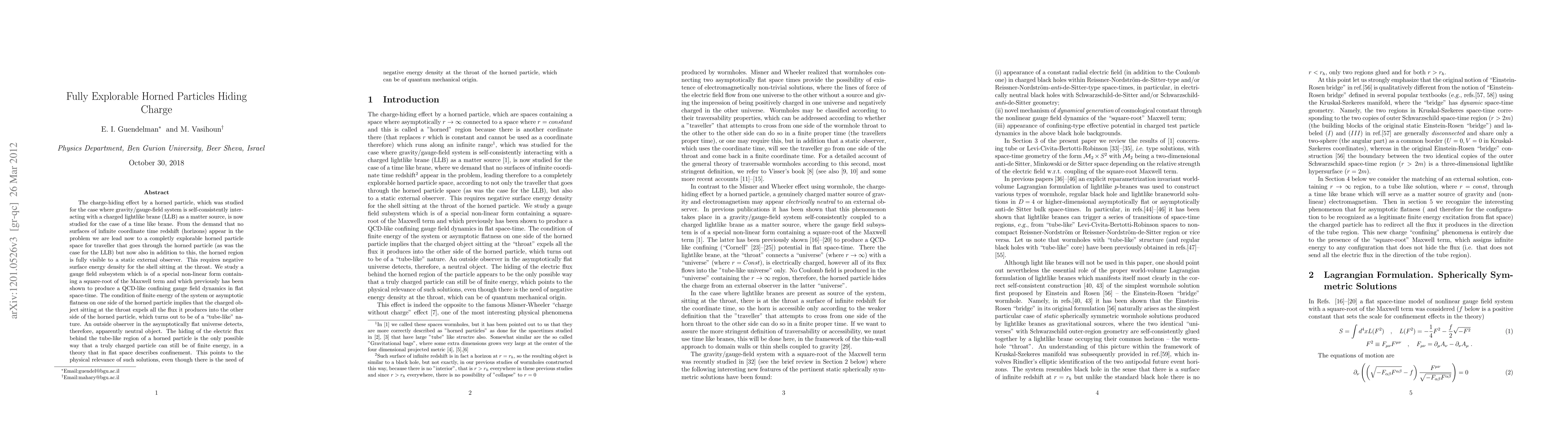 The charge-hiding effect by a horned particle, which was studied for the case where gravity/gauge-field system is self-consistently interacting with a charged lightlike brane (LLB) as a matter source, is now studied for the case of a time like brane. From the demand that no surfaces of infinite coordinate time redshift (horizons) appear in the problem we are lead now to a completly explorable horned particle space for traveller that goes through the horned particle (as was the case for the LLB) but now also in addition to this, the horned region is fully visible to a static external observer. This requires negative surface energy density for the shell sitting at the throat. We study a gauge field subsystem which is of a special non-linear form containing a square-root of the Maxwell term and which previously has been shown to produce a QCD-like confining gauge field dynamics in flat space-time. The condition of finite energy of the system or asymptotic flatness on one side of the horned particle implies that the charged object sitting at the throat expels all the flux it produces into the other side of the horned particle, which turns out to be of a "tube-like" nature. An outside observer in the asymptotically flat universe detects, therefore, apparently neutral object. The hiding of the electric flux behind the tube-like region of a horned particle is the only possible way that a truly charged particle can still be of finite energy, in a theory that in flat space describes confinement. This points to the physical relevance of such solutions, even though there is the need of negative energy density at the throat of the horned particle, which can be of quantum mechanical origin.