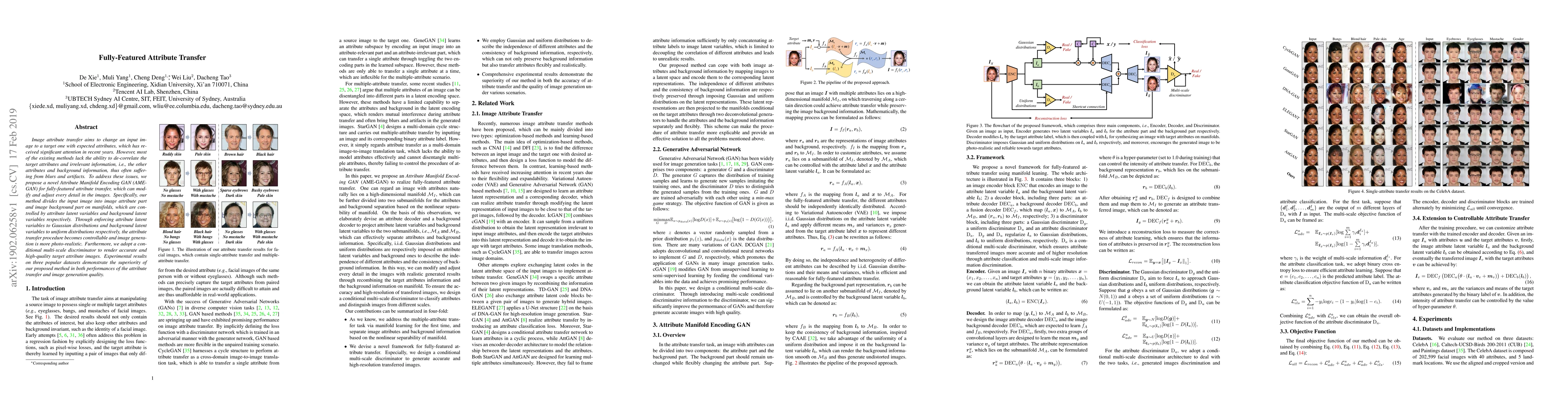 Image attribute transfer aims to change an input image to a target one with expected attributes, which has received significant attention in recent years. However, most of the existing methods lack the ability to de-correlate the target attributes and irrelevant information, i.e., the other attributes and background information, thus often suffering from blurs and artifacts. To address these issues, we propose a novel Attribute Manifold Encoding GAN (AME-GAN) for fully-featured attribute transfer, which can modify and adjust every detail in the images. Specifically, our method divides the input image into image attribute part and image background part on manifolds, which are controlled by attribute latent variables and background latent variables respectively. Through enforcing attribute latent variables to Gaussian distributions and background latent variables to uniform distributions respectively, the attribute transfer procedure becomes controllable and image generation is more photo-realistic. Furthermore, we adopt a conditional multi-scale discriminator to render accurate and high-quality target attribute images. Experimental results on three popular datasets demonstrate the superiority of our proposed method in both performances of the attribute transfer and image generation quality.