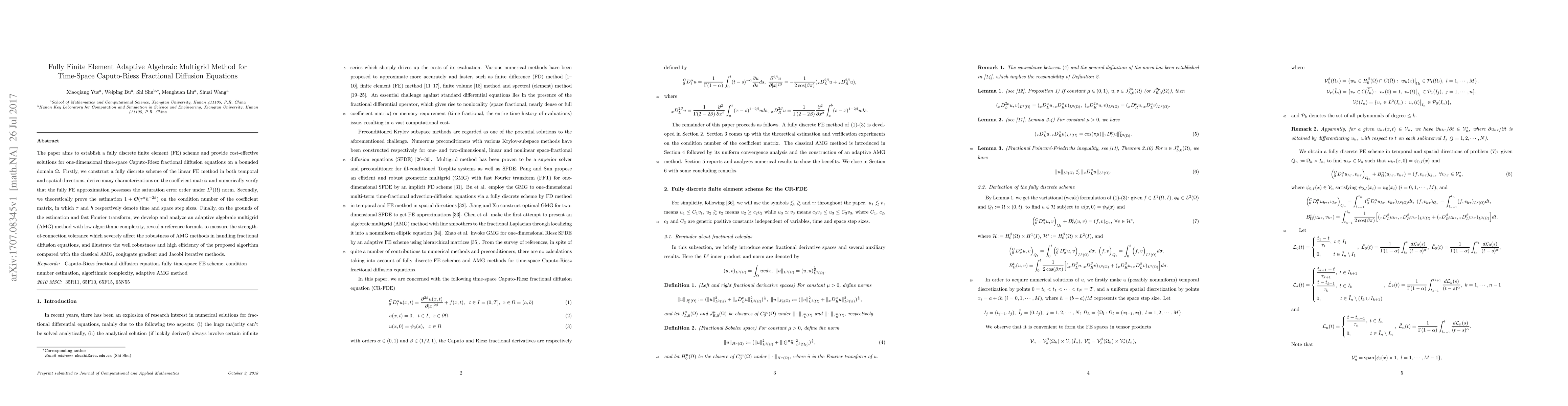 This paper develops a fully finite element adaptive algebraic multigrid method for solving one-dimensional time-space Caputo-Riesz fractional diffusion equations. It establishes a fully discrete finite element scheme, proves the condition number estimation, and demonstrates the robustness and efficiency of the proposed method compared to classical iterative methods.