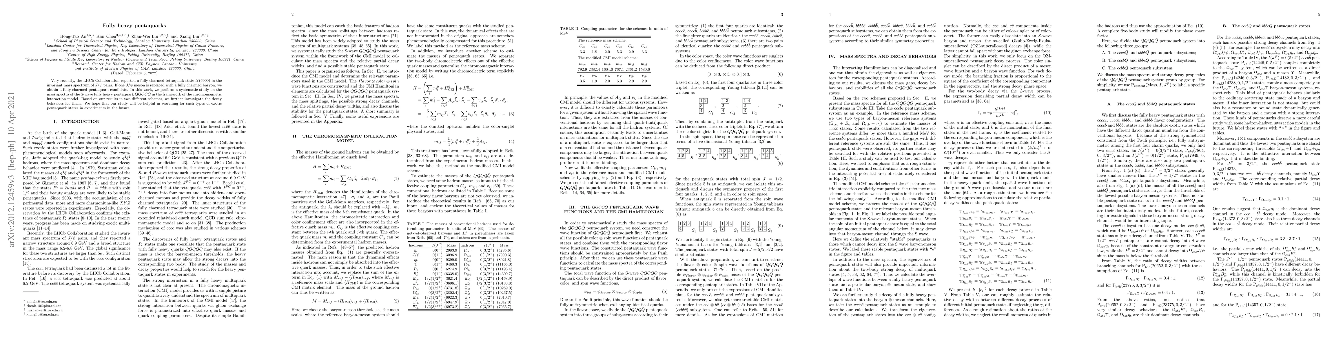 Very recently, the LHCb Collaboration reported a fully charmed tetraquark state $X(6900)$ in the invariant mass spectrum of $J/\psi$ pairs. If one $J/\psi$ meson is replaced with a fully charmed baryon, we obtain a fully charmed pentaquark candidate. In this work, we perform a systematic study on the mass spectra of the S-wave fully heavy pentaquark $QQQQ\bar{Q}$ in the framework of the chromomagnetic interaction model. Based on our results in two different schemes, we further investigate the decay behaviors for them. We hope that our study will be helpful in searching for such types of exotic pentaquark states in experiments in the future.