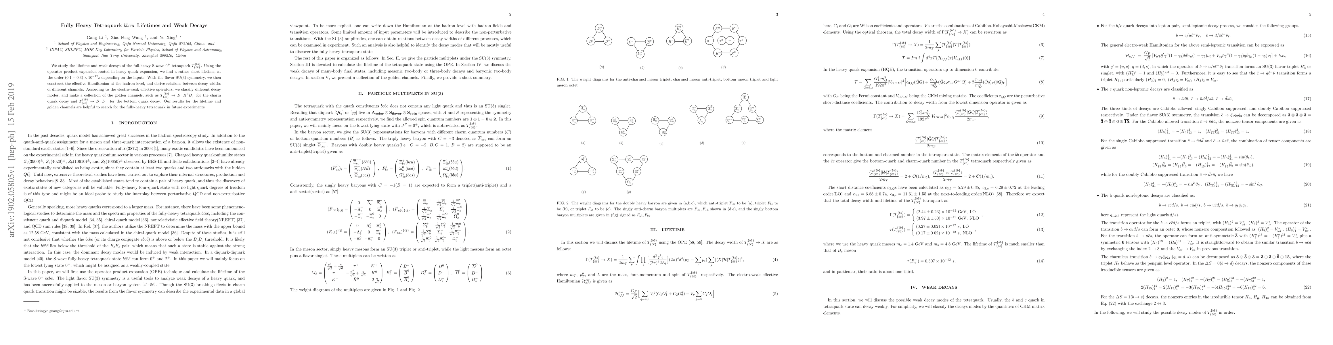 We study the lifetime and weak decays of the full-heavy S-wave $0^+$ tetraquark $T^{\{bb\}}_{\{\bar c\bar c\}}$. Using the operator product expansion rooted in heavy quark expansion, we find a rather short lifetime, at the order $(0.1-0.3)\times 10^{-12}s$ depending on the inputs. With the flavor SU(3) symmetry, we then construct the effective Hamiltonian at the hadron level, and derive relations between decay widths of different channels. According to the electro-weak effective operators, we classify different decay modes, and make a collection of the golden channels, such as $T_{\{\bar c \bar c\}}^{\{bb\}}\to B^- K^0 B_c^-$ for the charm quark decay and $T_{\{\bar c \bar c\}}^{\{bb\}}\to B^-D^-$ for the bottom quark decay. Our results for the lifetime and golden channels are helpful to search for the fully-heavy tetraquark in future experiments.