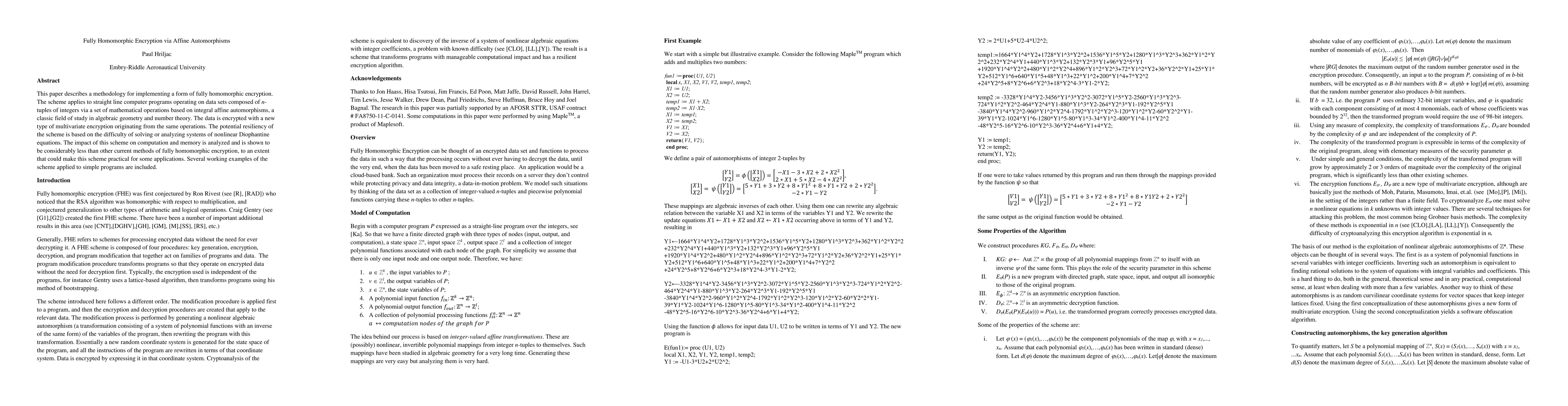 Homomorphic encryption is a method used in cryptopgraphy to create programs that can interact with encrypted data without ever leaving the data in the clear. This has many potential applications in cybersecurity. This paper uses automorphisms of affine space to create a form of homomorphic encryption for straight line programs. The encryption method used for the data is known as multivariate encryption. This gives a potentially powerful new method in cyber security based on techniques from algebraic geometry.