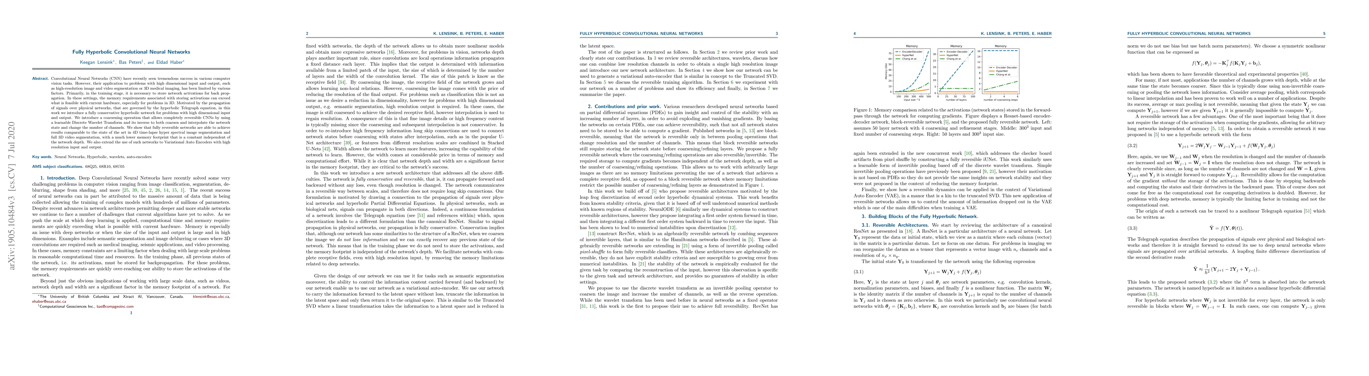 Convolutional Neural Networks (CNN) have recently seen tremendous success in various computer vision tasks. However, their application to problems with high dimensional input and output, such as high-resolution image and video segmentation or 3D medical imaging, has been limited by various factors. Primarily, in the training stage, it is necessary to store network activations for back propagation. In these settings, the memory requirements associated with storing activations can exceed what is feasible with current hardware, especially for problems in 3D. Motivated by the propagation of signals over physical networks, that are governed by the hyperbolic Telegraph equation, in this work we introduce a fully conservative hyperbolic network for problems with high dimensional input and output. We introduce a coarsening operation that allows completely reversible CNNs by using a learnable Discrete Wavelet Transform and its inverse to both coarsen and interpolate the network state and change the number of channels. We show that fully reversible networks are able to achieve results comparable to the state of the art in 4D time-lapse hyper spectral image segmentation and full 3D video segmentation, with a much lower memory footprint that is a constant independent of the network depth. We also extend the use of such networks to Variational Auto Encoders with high resolution input and output.