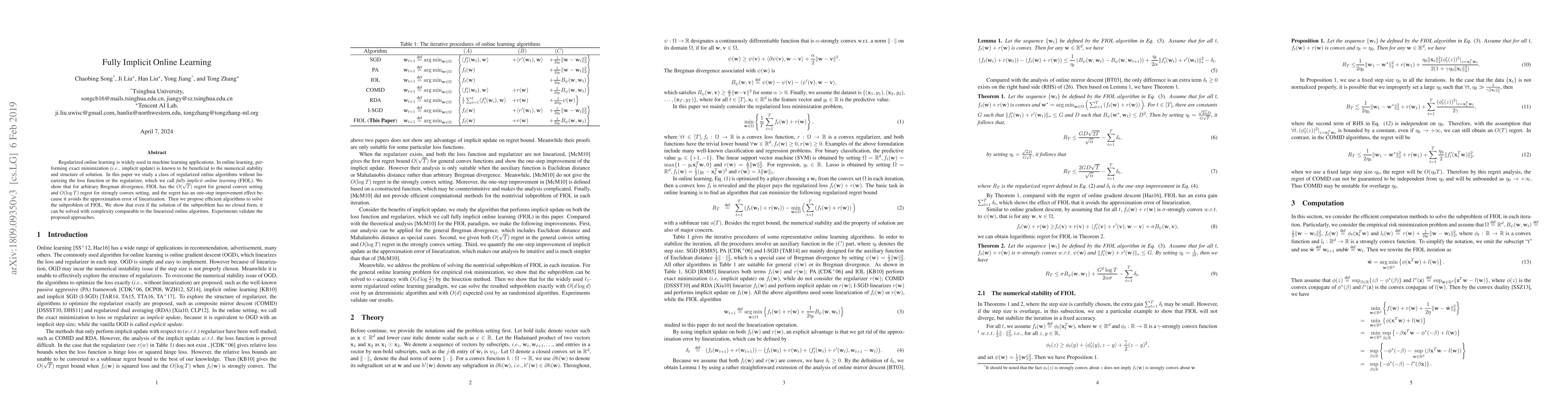 Regularized online learning is widely used in machine learning applications. In online learning, performing exact minimization ($i.e.,$ implicit update) is known to be beneficial to the numerical stability and structure of solution. In this paper we study a class of regularized online algorithms without linearizing the loss function or the regularizer, which we call \emph{fully implicit online learning} (FIOL). We show that for arbitrary Bregman divergence, FIOL has the $O(\sqrt{T})$ regret for general convex setting and $O(\log T)$ regret for strongly convex setting, and the regret has an one-step improvement effect because it avoids the approximation error of linearization. Then we propose efficient algorithms to solve the subproblem of FIOL. We show that even if the solution of the subproblem has no closed form, it can be solved with complexity comparable to the linearized online algoritms. Experiments validate the proposed approaches.