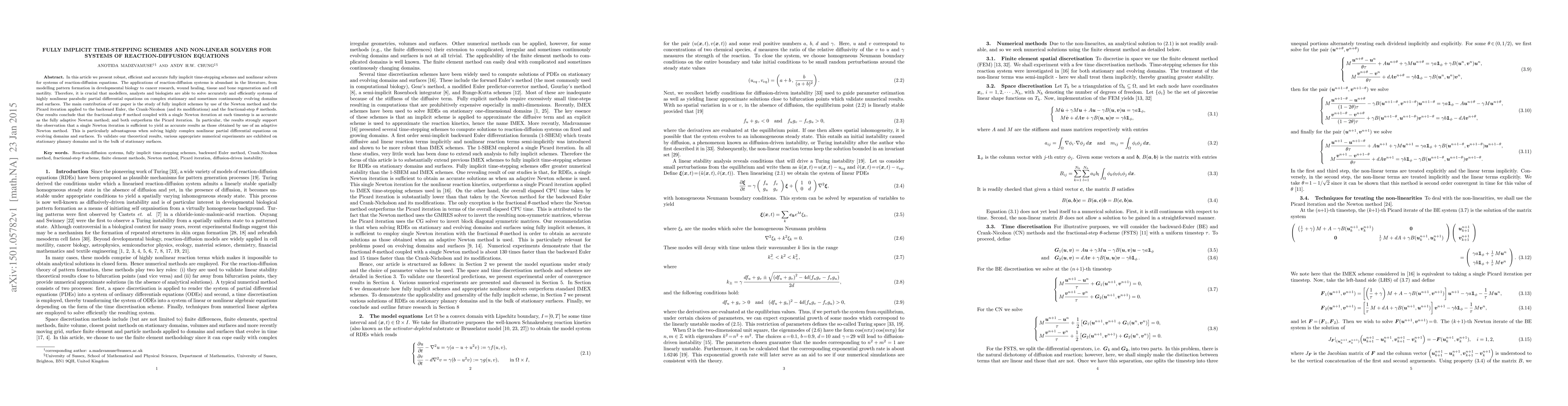 In this article we present robust, efficient and accurate fully implicit time-stepping schemes and nonlinear solvers for systems of reaction-diffusion equations. The applications of reaction-diffusion systems is abundant in the literature, from modelling pattern formation in developmental biology to cancer research, wound healing, tissue and bone regeneration and cell motility. Therefore, it is crucial that modellers, analysts and biologists are able to solve accurately and efficiently systems of highly nonlinear parabolic partial differential equations on complex stationary and sometimes continuously evolving domains and surfaces. The main contribution of our paper is the study of fully implicit schemes by use of the Newton method and the Picard iteration applied to the backward Euler, the Crank-Nicolson (and its modifications) and the fractional-step theta methods. Our results conclude that the fractional-step theta method coupled with a single Newton iteration at each timestep is as accurate as the fully adaptive Newton method; and both outperform the Picard iteration. In particular, the results strongly support the observation that a single Newton iteration is sufficient to yield as accurate results as those obtained by use of an adaptive Newton method. This is particularly advantageous when solving highly complex nonlinear partial differential equations on evolving domains and surfaces. To validate our theoretical results, various appropriate numerical experiments are exhibited on stationary planary domains and in the bulk of stationary surfaces.