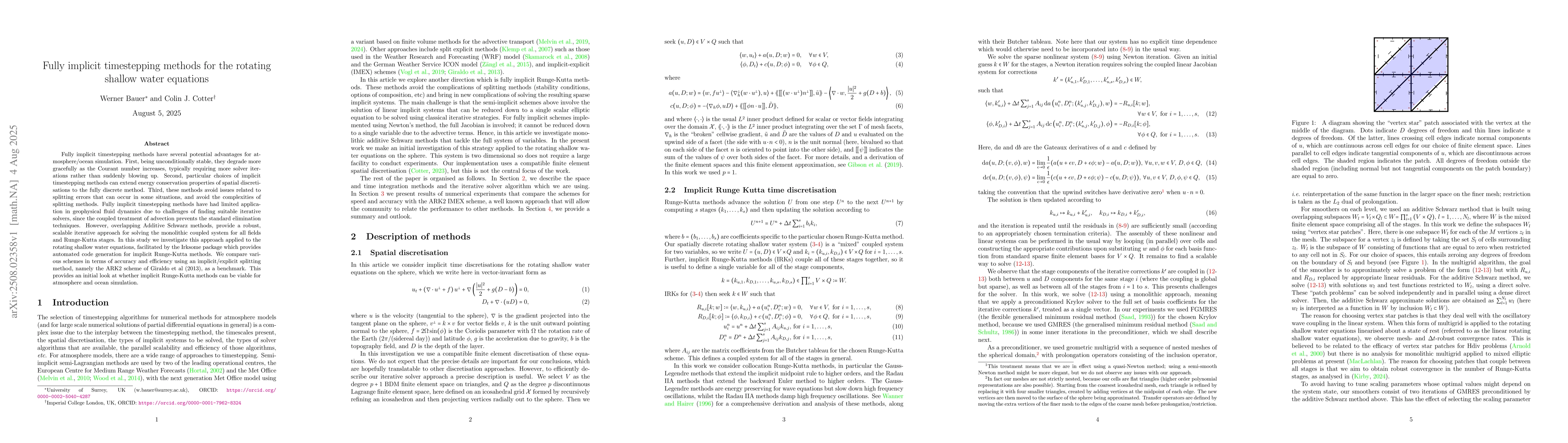 Fully implicit timestepping methods have several potential advantages for atmosphere/ocean simulation. First, being unconditionally stable, they degrade more gracefully as the Courant number increases, typically requiring more solver iterations rather than suddenly blowing up. Second, particular choices of implicit timestepping methods can extend energy conservation properties of spatial discretisations to the fully discrete method. Third, these methods avoid issues related to splitting errors that can occur in some situations, and avoid the complexities of splitting methods. Fully implicit timestepping methods have had limited application in geophysical fluid dynamics due to challenges of finding suitable iterative solvers, since the coupled treatment of advection prevents the standard elimination techniques. However, overlapping Additive Schwarz methods, provide a robust, scalable iterative approach for solving the monolithic coupled system for all fields and Runge-Kutta stages. In this study we investigate this approach applied to the rotating shallow water equations, facilitated by the Irksome package which provides automated code generation for implicit Runge-Kutta methods. We compare various schemes in terms of accuracy and efficiency using an implicit/explicit splitting method, namely the ARK2 scheme of Giraldo et al (2013), as a benchmark. This provides an initial look at whether implicit Runge-Kutta methods can be viable for atmosphere and ocean simulation.
