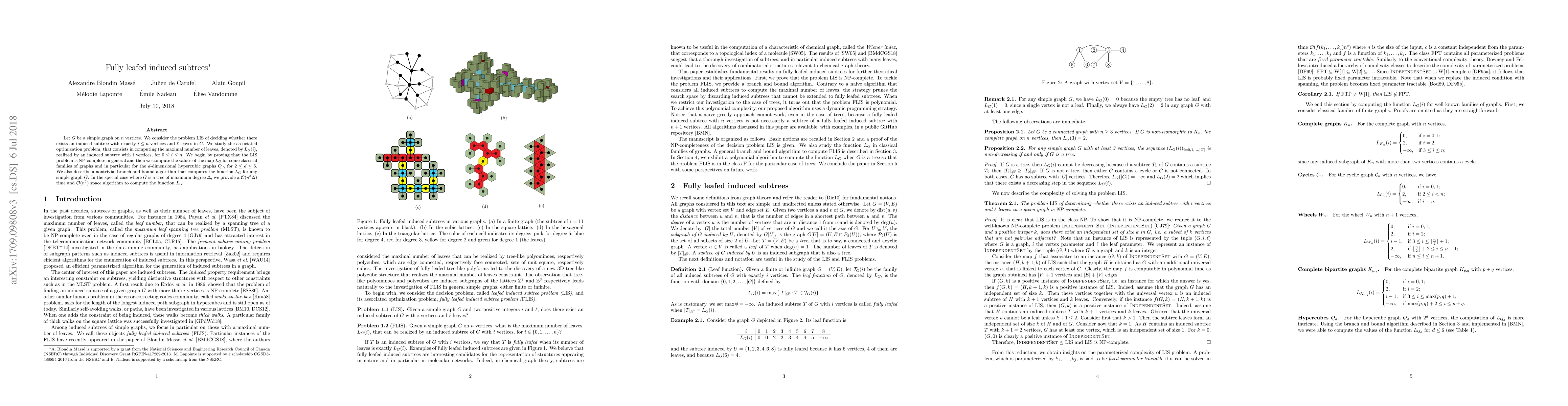 Let $G$ be a simple graph on $n$ vertices. We consider the problem LIS of deciding whether there exists an induced subtree with exactly $i \leq n$ vertices and $\ell$ leaves in $G$. We study the associated optimization problem, that consists in computing the maximal number of leaves, denoted by $L_G(i)$, realized by an induced subtree with $i$ vertices, for $0 \le i \le n$. We begin by proving that the LIS problem is NP-complete in general and then we compute the values of the map $L_G$ for some classical families of graphs and in particular for the $d$-dimensional hypercubic graphs $Q_d$, for $2 \leq d \leq 6$. We also describe a nontrivial branch and bound algorithm that computes the function $L_G$ for any simple graph $G$. In the special case where $G$ is a tree of maximum degree $\Delta$, we provide a $\mathcal{O}(n^3\Delta)$ time and $\mathcal{O}(n^2)$ space algorithm to compute the function $L_G$.