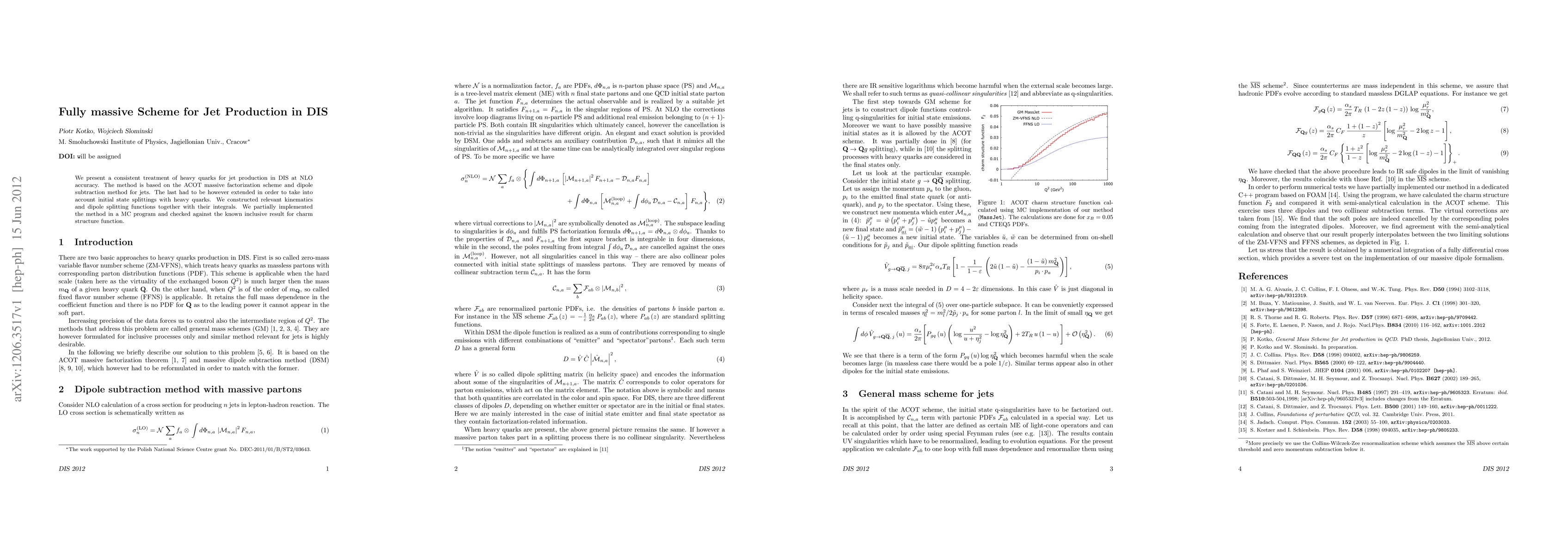 This paper develops a fully massive scheme for jet production in deep inelastic scattering (DIS) at next-to-leading order (NLO) accuracy using the ACOT factorization and dipole subtraction method, extending it to include heavy quarks. The authors constructed necessary kinematic functions and dipole splitting functions, partially implementing the method in a Monte Carlo program and validating it against known charm structure function results.