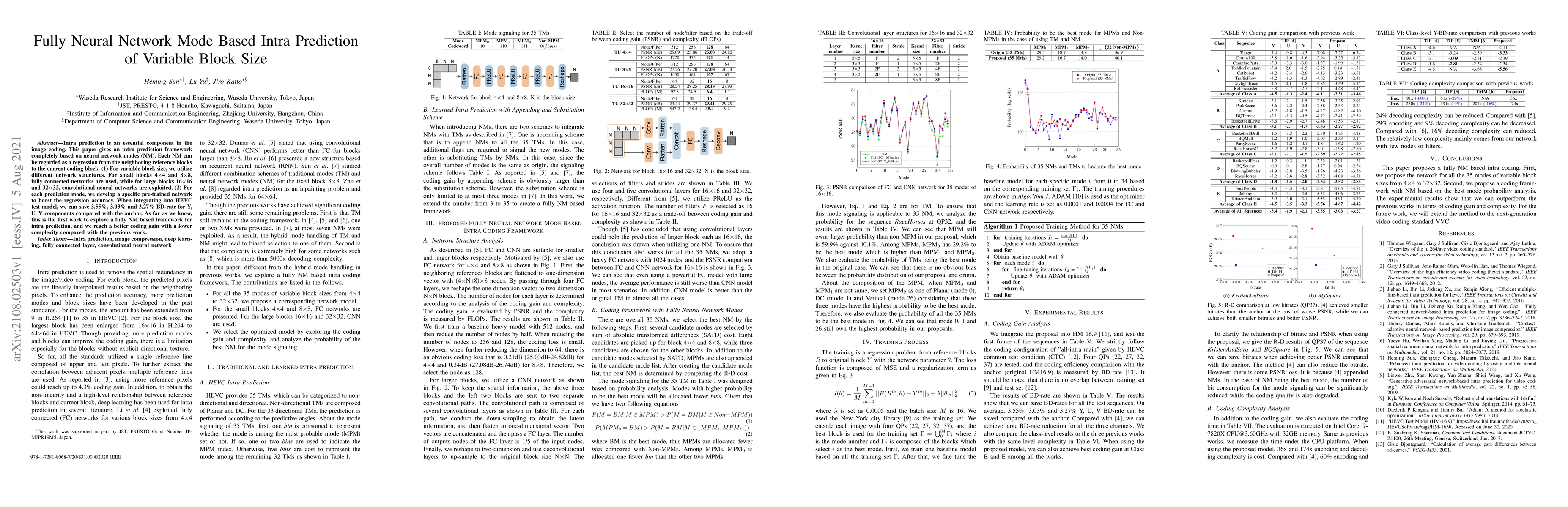 This paper presents a fully neural network mode (NM) based intra prediction framework for variable block sizes in image coding, utilizing different network structures for small and large blocks. The approach achieves better coding gain and lower complexity compared to previous methods, saving BD-rate by 3.55%, 3.03%, and 3.27% for Y, U, and V components respectively.