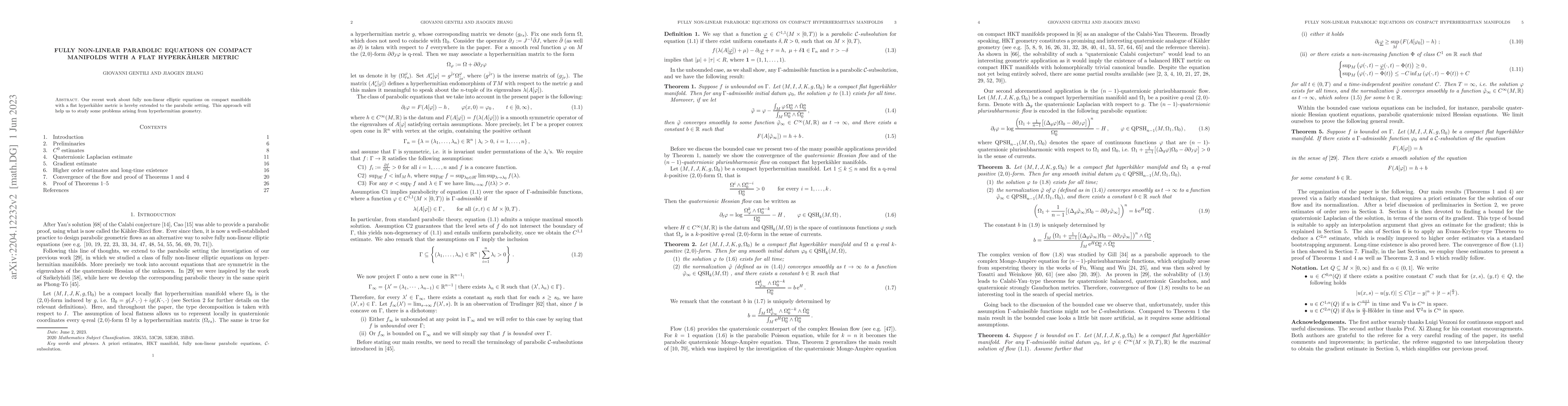 Summary: This paper extends the study of fully non-linear elliptic equations on compact manifolds with a flat hyperkähler metric to the parabolic setting, aiming to address problems from hyperhermitian geometry. The new approach provides insights into dynamic processes in this geometric context.