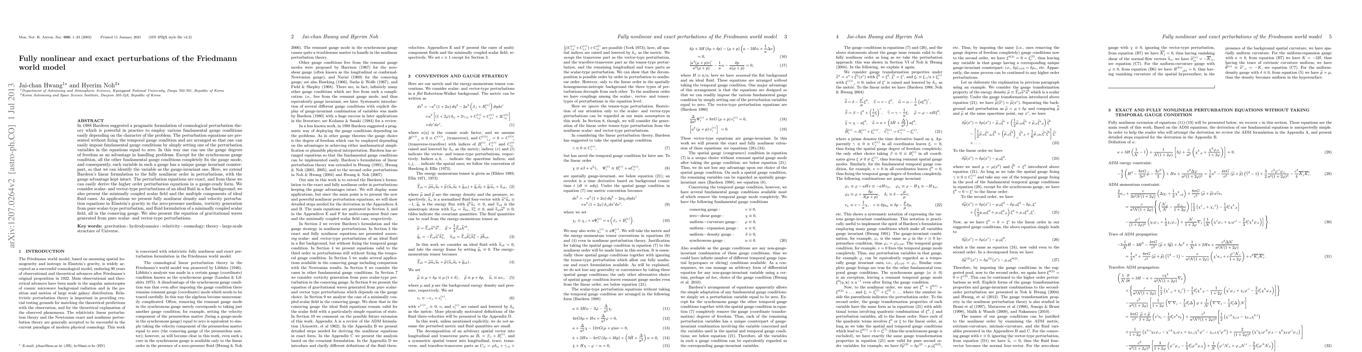 This paper extends Bardeen's linear cosmological perturbation theory to fully nonlinear order while maintaining gauge flexibility, presenting exact equations for scalar and vector perturbations in a flat background, including ideal fluid and minimally coupled scalar field cases, and deriving equations for density, velocity, vorticity, and gravitational waves.