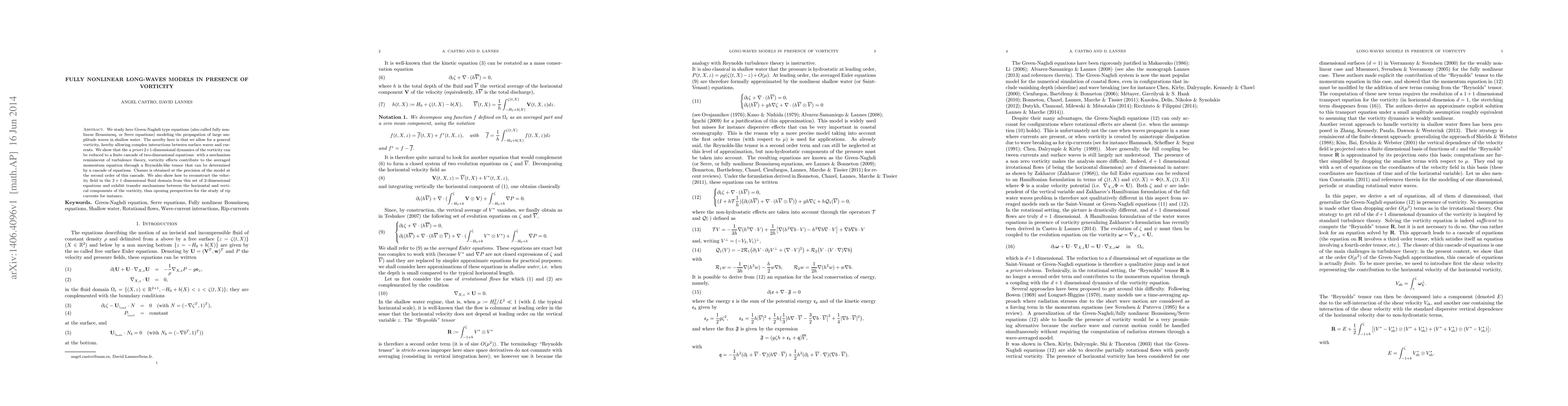 We study here Green-Naghdi type equations (also called fully nonlinear Boussinesq, or Serre equations) modeling the propagation of large amplitude waves in shallow water. The novelty here is that we allow for a general vorticity, hereby allowing complex interactions between surface waves and currents. We show that the a priori 2+1-dimensional dynamics of the vorticity can be reduced to a finite cascade of two-dimensional equations: with a mechanism reminiscent of turbulence theory, vorticity effects contribute to the averaged momentum equation through a Reynolds-like tensor that can be determined by a cascade of equations. Closure is obtained at the precision of the model at the second order of this cascade. We also show how to reconstruct the velocity field in the 2 + 1 dimensional fluid domain from this set of 2-dimensional equations and exhibit transfer mechanisms between the horizontal and vertical components of the vorticity, thus opening perspectives for the study of rip currents for instance.