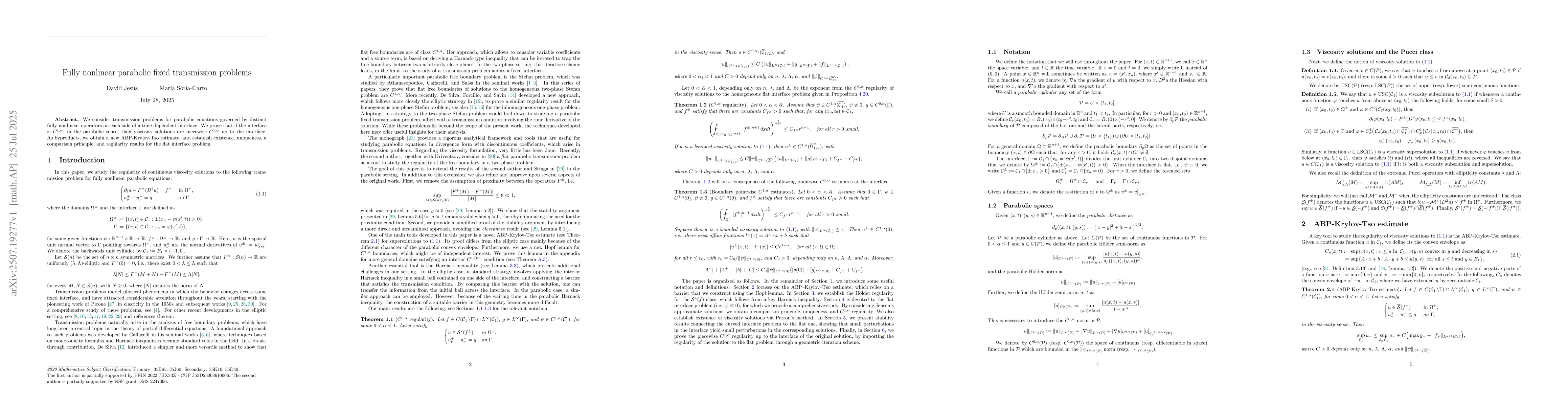 We consider transmission problems for parabolic equations governed by distinct fully nonlinear operators on each side of a time-dependent interface. We prove that if the interface is $C^{1,\alpha}$, in the parabolic sense, then viscosity solutions are piecewise $C^{1,\alpha}$ up to the interface. As byproducts, we obtain a new ABP-Krylov-Tso estimate, and establish existence, uniqueness, a comparison principle, and regularity results for the flat interface problem.