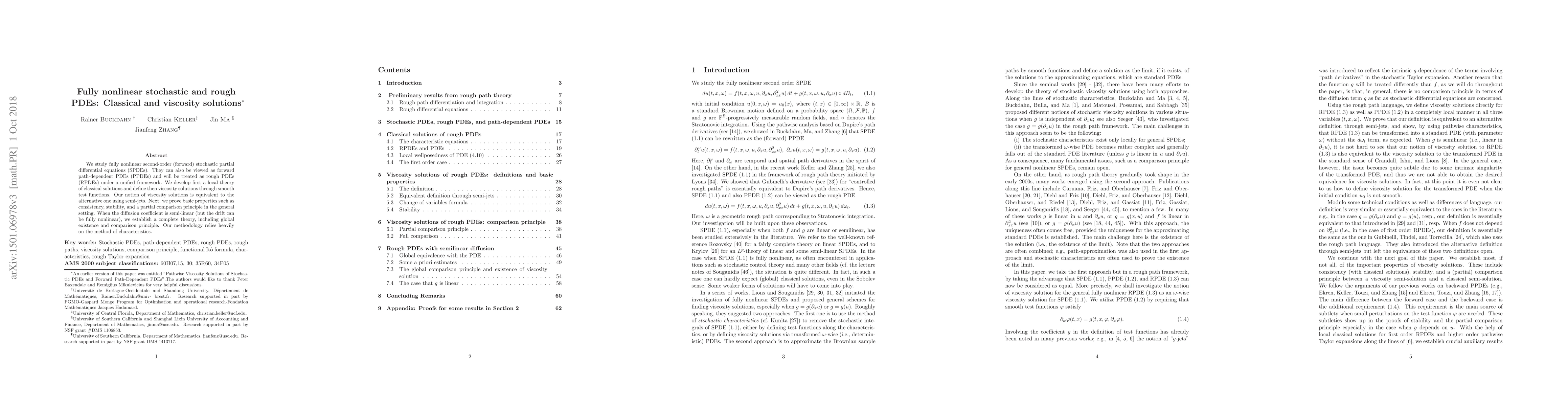 This paper explores fully nonlinear second-order stochastic partial differential equations (SPDEs) and their classical and viscosity solutions, treating them under a unified framework of rough PDEs (RPDEs). It establishes a theory for classical solutions and defines viscosity solutions, proving properties like consistency and stability, and presenting a complete theory for semi-linear diffusion coefficients.