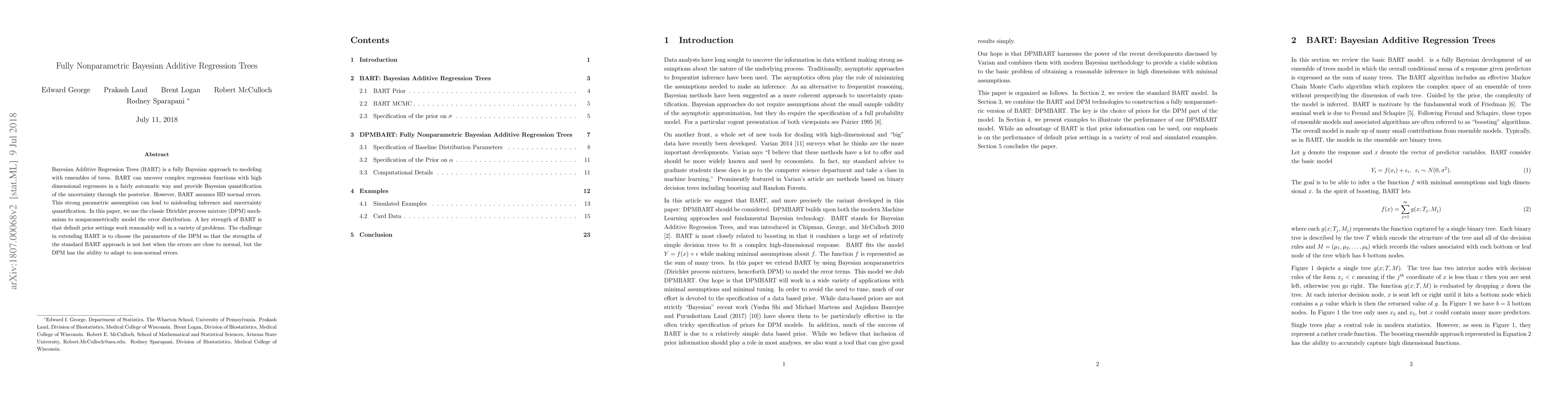 This paper extends Bayesian Additive Regression Trees (BART) by employing a nonparametric Dirichlet process mixture (DPM) to model error distributions, thus allowing BART to handle complex, non-normal error structures while retaining its strengths for normally distributed errors.